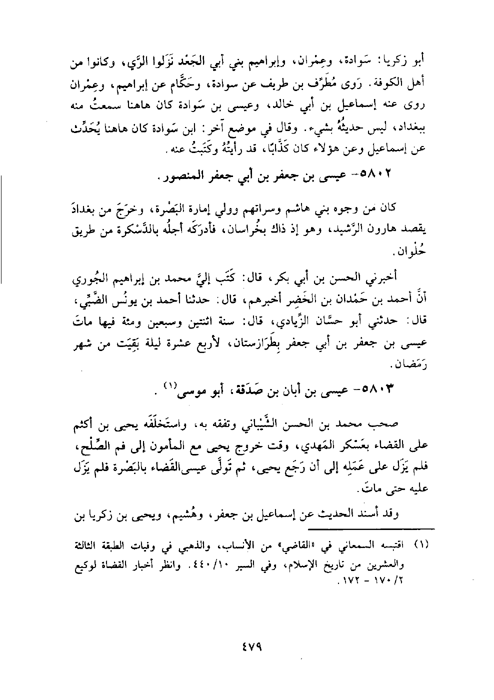 5802 - عيسى بن جعفر بن أبي جعفر المنصور كان من وجوه بني هاشم وسراتهم وولي إمارة البصرة، وخرج من بغداد يقصد هارون الرشيد، وهو إذ ذاك بخراسان، فأدركه أجله بالدسكرة من طريق حلوان.