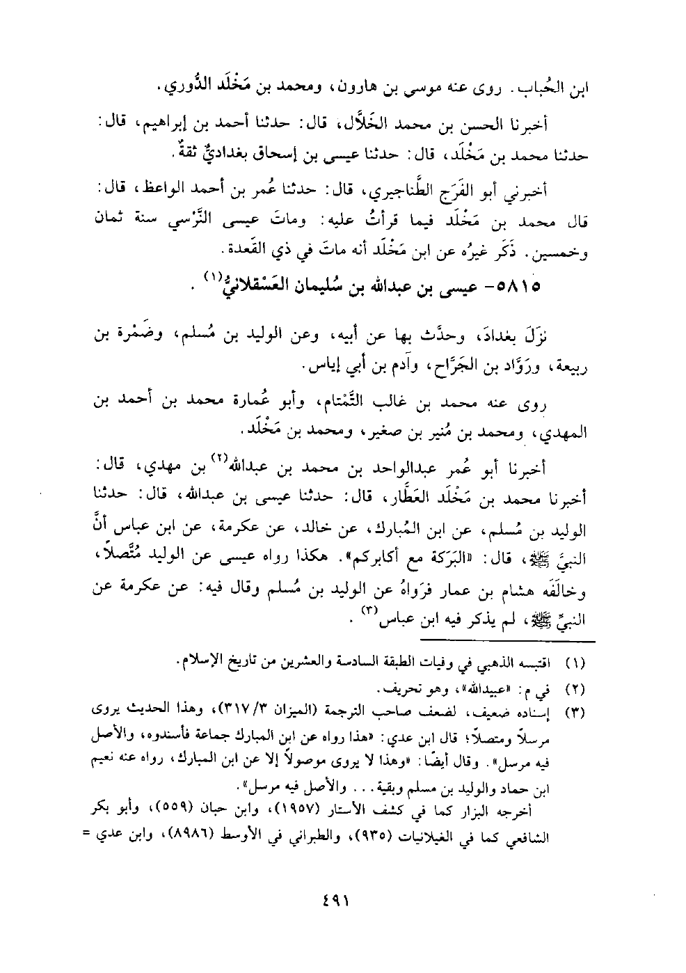 5815 - عيسى بن عبد الله بن سليمان العسقلاني نزل بغداد، وحدث بها عن أبيه، وعن الوليد بن مسلم، وضمرة بن ربيعة، ورواد بن الجراح، وآدم بن أبي إياس.