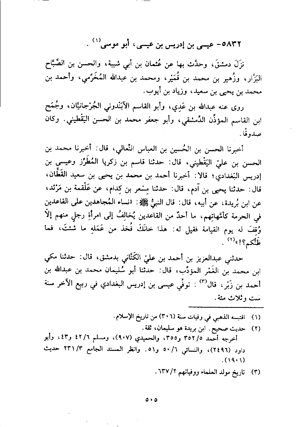(3701) -[12: 505] أَخْبَرَنَا الْحَسَنُ بْنُ الْحُسَيْنِ بْنِ الْعَبَّاسِ النِّعَالِيُّ، قَالَ: أَخْبَرَنَا مُحَمَّدُ بْنُ الْحَسَنِ بْنِ عَلِيٍّ الْيَقْطِينِيُّ، قَالَ: حَدَّثَنَا قَاسِمُ بْنُ زَكَرِيَّا الْمُطَرِّزُ وَعِيسَى بْنُ إِدْرِيسَ الْبَغْدَادِيُّ، قَالا: أَخْبَرَنَا أَحْمَدُ بْنُ مُحَمَّدِ بْنِ يَحْيَى بْنِ سَعِيدٍ الْقَطَّانُ، قَالَ: حَدَّثَنَا يَحْيَى بْنُ آدَمَ، قَالَ: حَدَّثَنَا مِسْعَرُ بْنُ كِدَامٍ، عَنْ عَلْقَمَةَ بْنِ مَرْثَدٍ، عَنِ ابْنِ بُرَيْدَةَ، عَنْ أَبِيهِ، قَالَ: قَالَ النَّبِيُّ صَلَّى اللَّهُ عَلَيْهِ وَسَلَّمَ: " نِسَاءُ الْمُجَاهِدِينَ عَلَى الْقَاعِدِينَ فِي الْحُرْمَةِ كَأُمَّهَاتِهِمْ، مَا أَحَدٌ مِنَ الْقَاعِدِينَ يُخَالِفُ إِلَى امْرَأَةِ رَجُلٍ مِنْهُمْ إِلا وُقِفَ لَهُ يَوْمَ الْقِيَامَةِ فَقِيلَ لَهُ: هَذَا خَانَكَ فَخُذْ مِنْ عَمَلِهِ مَا شِئْتَ، فَمَا ظَنُّكُمْ؟! " حَدَّثَنِي عبد العزيز بن أحمد بن علي الكتاني بدمشق، قال: حَدَّثَنَا مكي بن محمد بن الغمر المؤدب، قال: حَدَّثَنَا أبو سليمان محمد بن عبد الله بن أحمد بن زبر، قال: توفي عيسى بن إدريس البغدادي في ربيع الآخر سنة ست وثلاث مائة