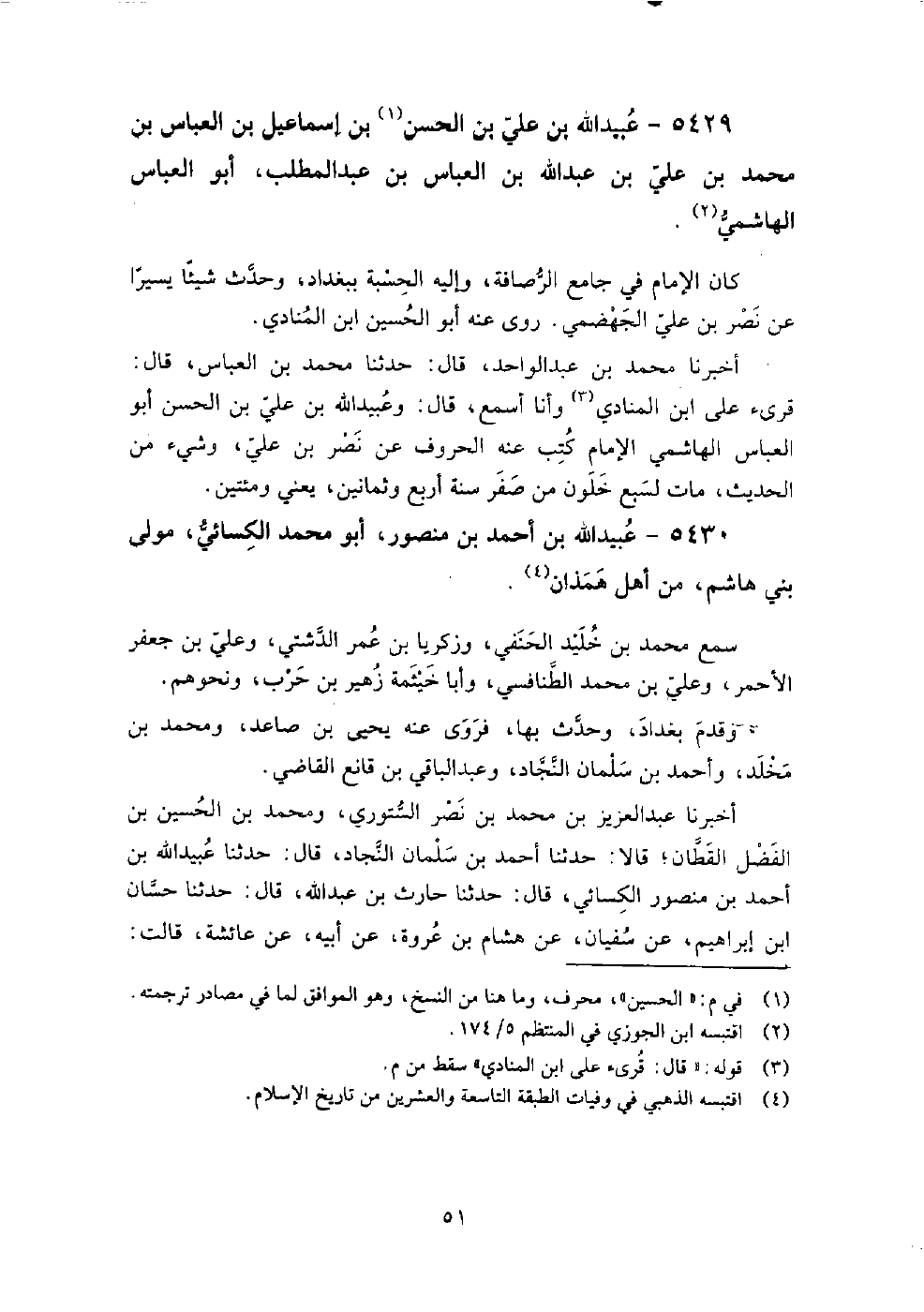 5429 - عبيد الله بن علي بن الحسن بن إسماعيل بن العباس بن محمد بن علي بن عبد الله بن العباس بن عبد المطلب أبو العباس الهاشمي كان الإمام في جامع الرصافة، وإليه الحسبة ببغداد، وحدث شيئا يسيرا عن نصر بن علي الجهضمي.