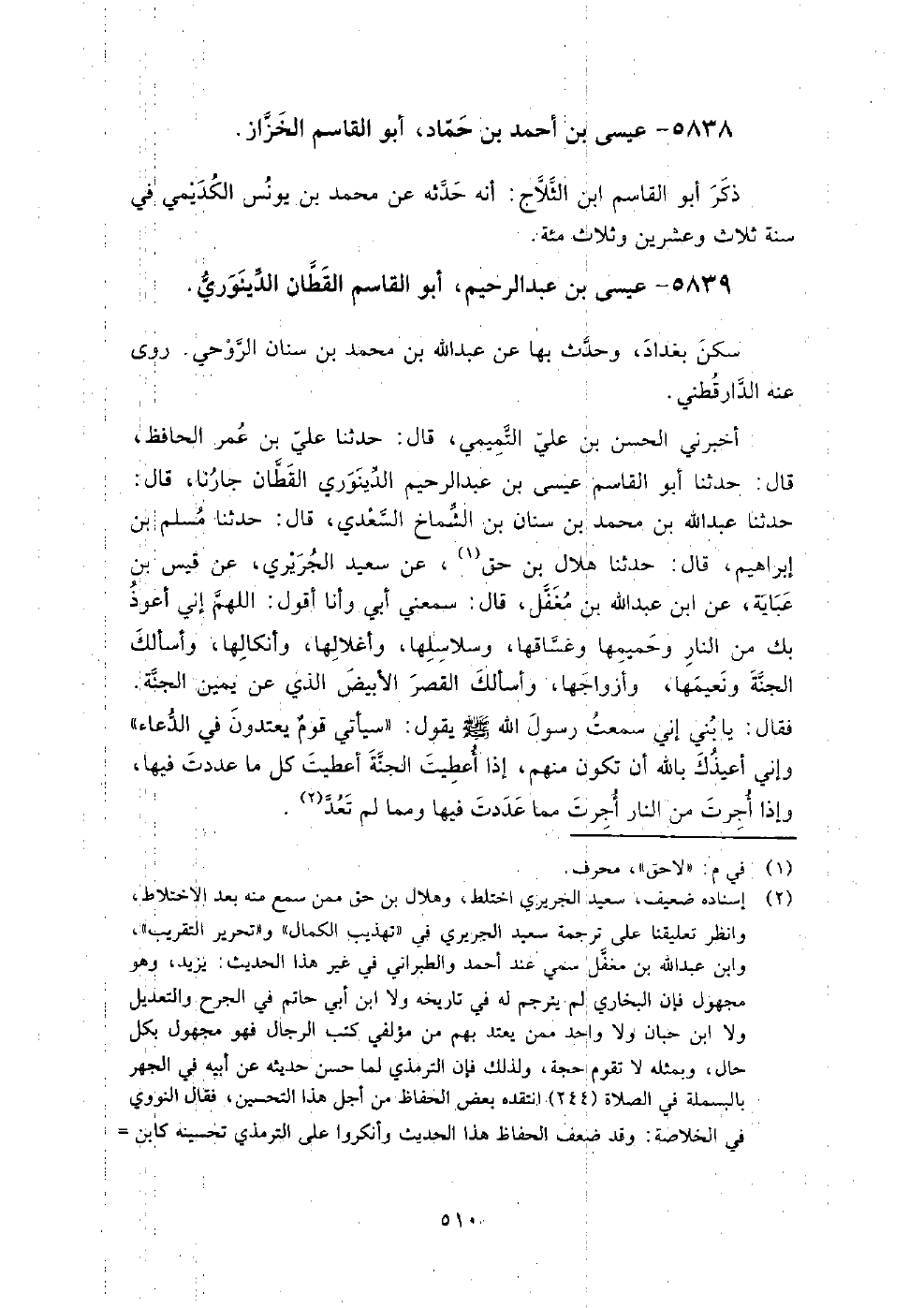 5839 - عيسى بن عبد الرحيم، أبو القاسم القطان الدينوري سكن بغداد، وحدث بها عن عبد الله بن محمد بن سنان الروحي.