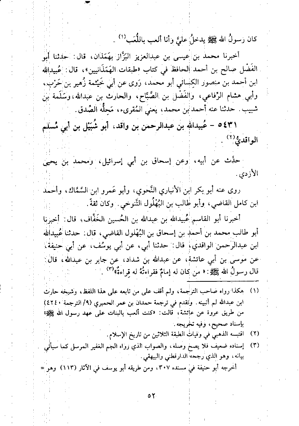(3474) -[12: 52] أَخْبَرَنَا أَبُو الْقَاسِمِ عُبَيْدُ اللَّهِ بْنُ عَبْدِ اللَّهِ بْنِ الْحُسَيْنِ الْخَفَّافُ، قَالَ: أَخْبَرَنَا أَبُو طَالِبٍ مُحَمَّدُ بْنُ أَحْمَدَ بْنِ إِسْحَاقَ بْنِ الْبُهْلُولِ الْقَاضِي، قَالَ: حَدَّثَنَا عُبَيْدُ اللَّهِ بْنُ عَبْدِ الرَّحْمَنِ الْوَاقِدِيُّ، قَالَ: حَدَّثَنَا أَبِي، عَنْ أَبِي يُوسُفَ، عَنْ أَبِي حَنِيفَةَ، عَنْ مُوسَى بْنِ أَبِي عَائِشَةَ، عَنْ عَبْدِ اللَّهِ بْنِ شَدَّادٍ، عَنْ جَابِرِ بْنِ عَبْدِ اللَّهِ، قَالَ: قَالَ رَسُولُ اللَّهِ صَلَّى اللَّهُ عَلَيْهِ وَسَلَّمَ: " مَنْ كَانَ لَهُ إِمَامٌ فَقِرَاءَتُهُ لَهُ قِرَاءَةٌ " أَخْبَرَنَا علي بن محمد السمسار، قَالَ: أَخْبَرَنَا عبد الله بن عثمان الصفار، قال: حَدَّثَنَا عبد الباقي بن قانع " أن أبا شبيل بن واقد مات في سنة ثمان وتسعين ومئتين.