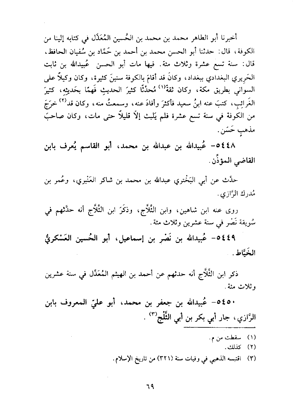 5450 - عبيد الله بن جعفر بن محمد أبو علي المعروف بابن الرازي جار أبي بكر بن أبي الثلج سمع: عباس بن محمد الدوري، وإبراهيم بن نصر الكندي، والحسن بن علي بن عفان العامري، والحسين بن فهم.