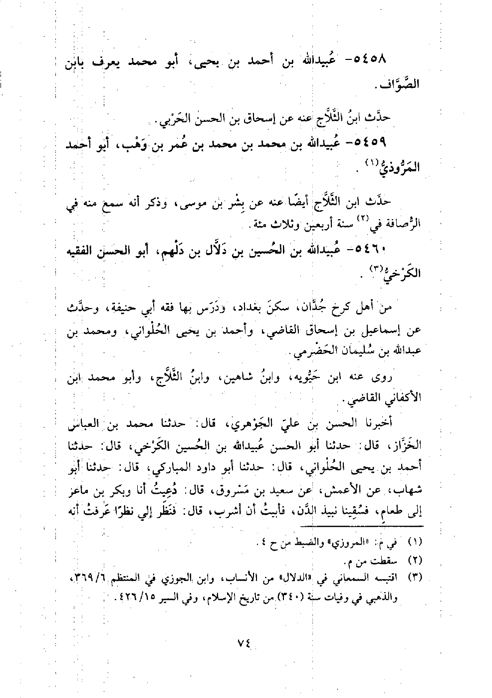 5459 - عبيد الله بن محمد بن محمد بن عمر بن وهب أبو أحمد المروذي حدث ابن الثلاج أيضا عنه عن بشر بن موسى، وذكر أنه، سمع منه في الرصافة في سنة أربعين وثلاث مائة.