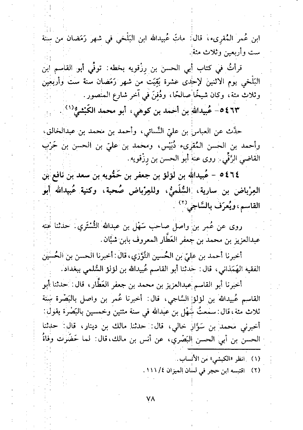 5464 - عبيد الله بن لؤلؤ بن جعفر بن حمويه بن سعد بن نافع بن العرباض بن سارية السلمي وللعرباض صحبة وكنية عبيد الله أبو القاسم ويعرف بالساجي،