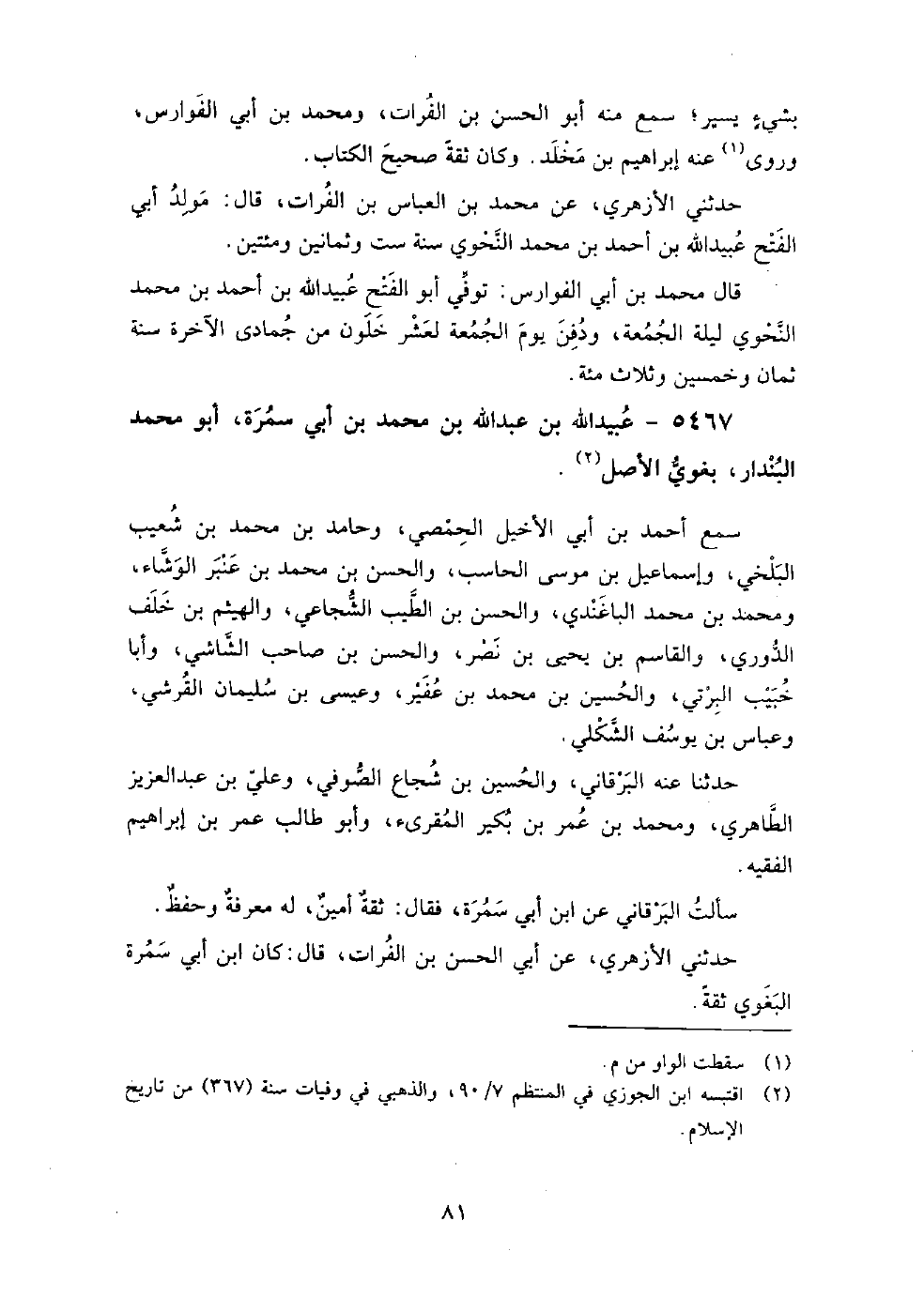 حَدَّثَنِي الأزهري، عن أبي الحسن بن الفرات، قال: كان ابن أبي سمرة البغوي ثقة قال محمد بن أبي الفوارس: توفي أبو محمد عبيد الله بن عبد الله بن محمد بن أبي سمرة البغوي في شهر ربيع الآخر سنة سبع وستين وثلاث مائة وكان لا بأس به.