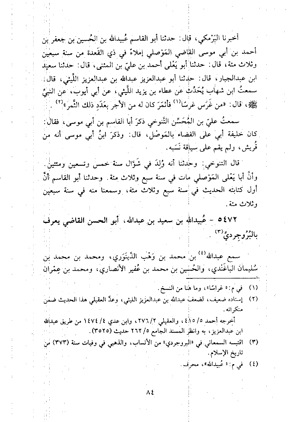 5472 - عبيد الله بن سعيد بن عبد الله أبو الحسن القاضي يعرف بالبروجردي سمع: عبد الله بن محمد بن وهب الدينوري، ومحمد بن محمد بن سليمان الباغندي، والحسين بن محمد بن عفير الأنصاري، ومحمد بن عمران ابن هارون الدينوري، ومحمد بن إبراهيم بن إسحاق الأصبهاني شيخا يروي عن أبي مسعود أحمد بن الفرات.