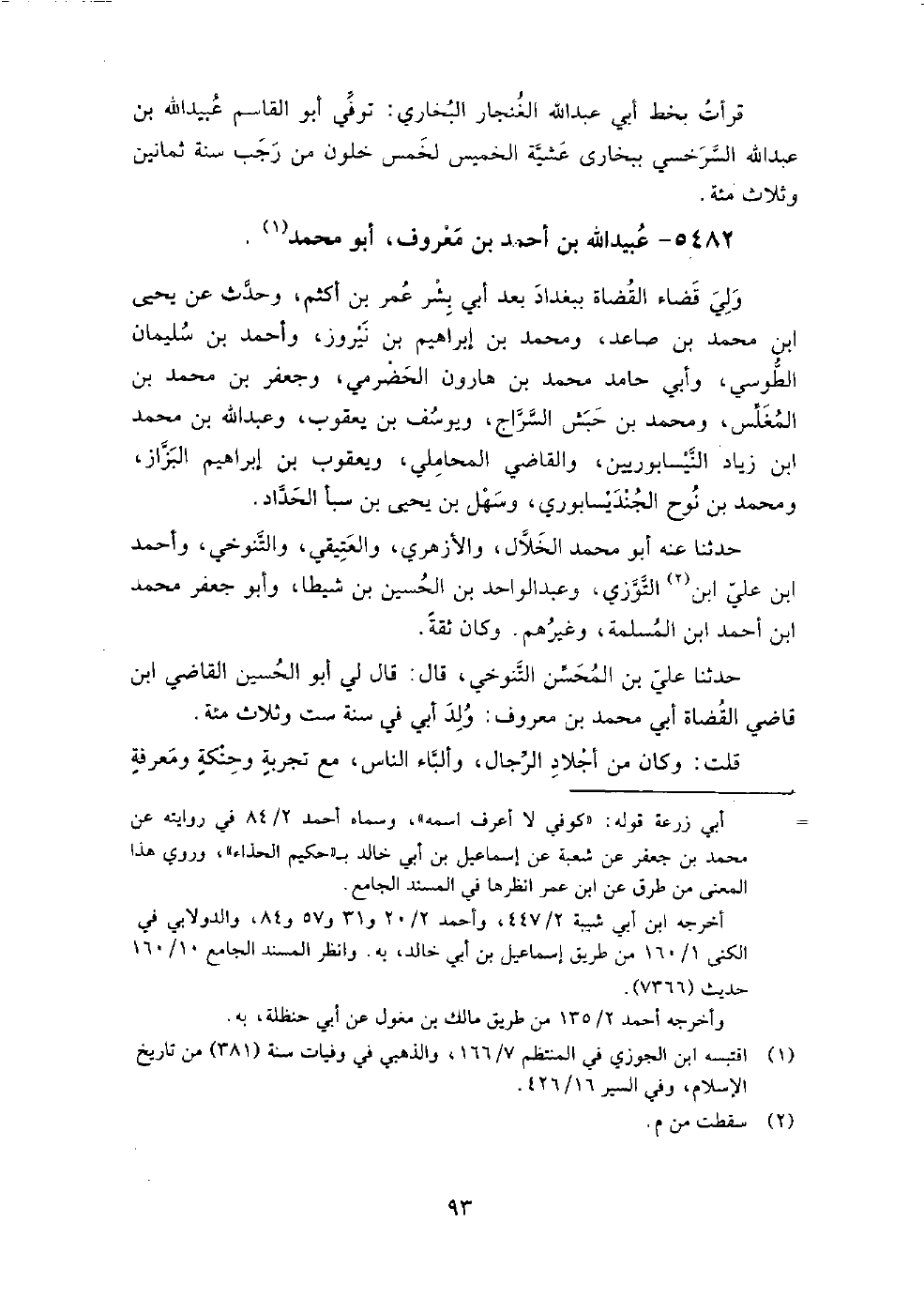 5482 - عبيد الله بن أحمد بن معروف أبو محمد ولي قضاء القضاة ببغداد بعد أبي بشر عمر بن أكثم، وحدث عن يحيى بن محمد بن صاعد، ومحمد بن إبراهيم بن نيروز، وأحمد بن سليمان الطوسي، وأبي حامد محمد بن هارون الحضرمي، وجعفر بن محمد بن المغلس، ومحمد بن حبش السراج، ويوسف بن يعقوب، وعبد الله بن محمد بن زياد النيسابوريين، والقاضي المحاملي، ويعقوب بن إبراهيم البزاز، ومحمد بن نوح الجنديسابوري، وسهل بن يحيى بن سبأ الحداد.