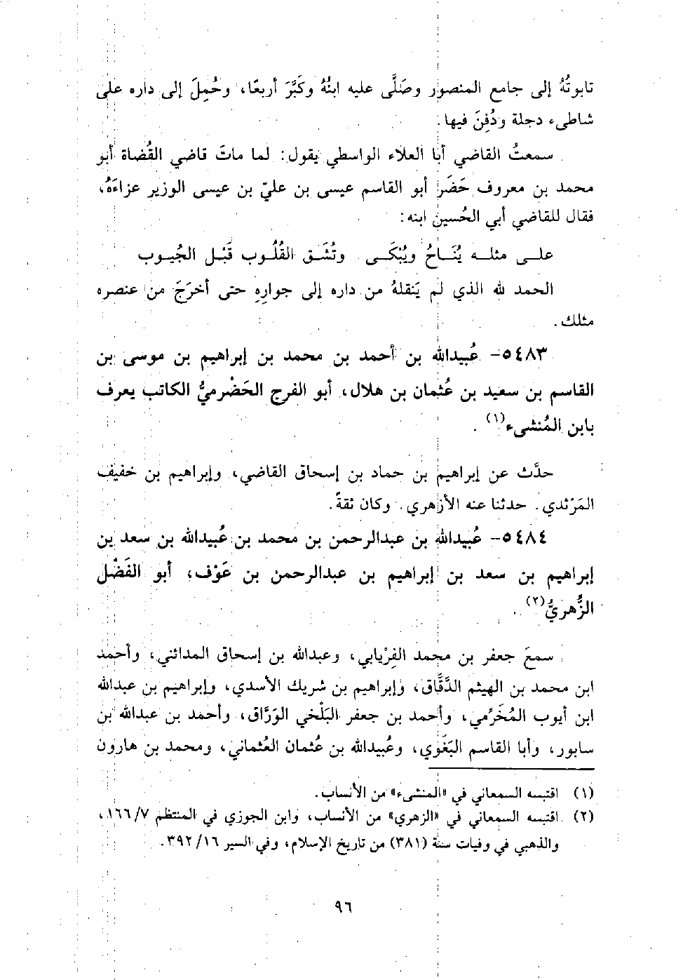 5483 - عبيد الله بن أحمد بن محمد بن إبراهيم بن موسى بن القاسم بن سعيد بن عثمان بن هلال أبو الفرج الحضرمي الكاتب يعرف، بابن المنشئ حدث عن: إبراهيم بن حماد بن إسحاق القاضي، وإبراهيم بن خفيف المرثدي، حَدَّثَنَا عنه الأزهري، وكان ثقة.