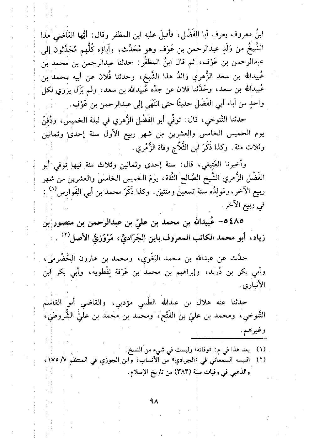 5485 - عبيد الله بن محمد بن علي بن عبد الرحمن بن منصور بن زياد أبو محمد الكاتب المعروف بابن الجرادي مروزي الأصل، حدث عن عبد الله بن محمد البغوي، ومحمد بن هارون الحضرمي، وأبي بكر بن دريد، وإبراهيم بن محمد بن عرفة نفطويه، وأبي بكر ابن الأنباري.