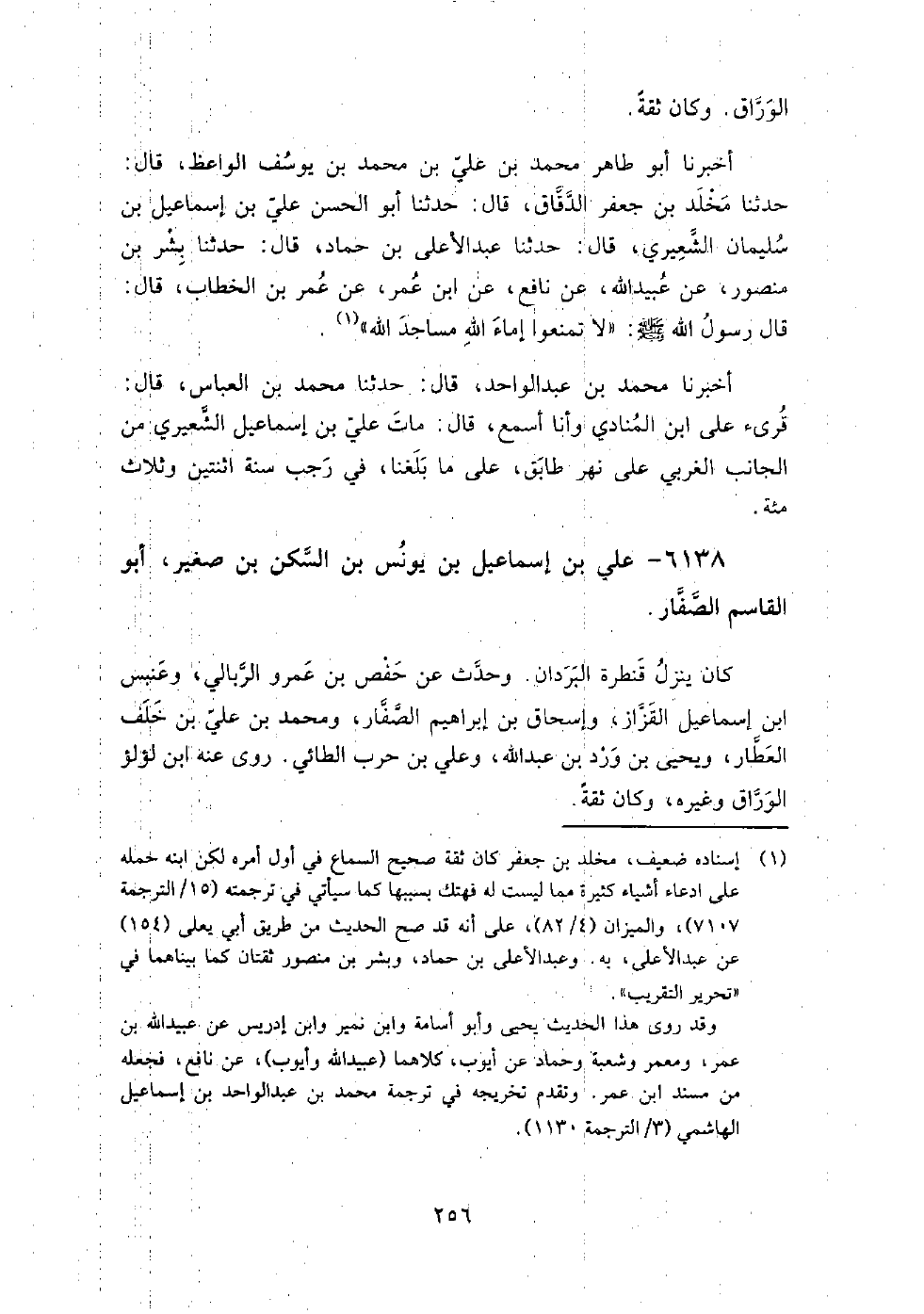 6138 - علي بْن إِسْمَاعِيل بْن يونس بْن السكن بْن صغير أَبُو القاسم الصفار كان ينزل قنطرة البردان، وحدث عَن حفص بْن عَمْرو الربالي، وعنبس بْن إِسْمَاعِيل القزاز، وإسحاق بْن إِبْرَاهِيم الصفار، ومحمد بْن علي بْن خلف العطار، ويحيى بْن ورد بْن عَبْد اللَّه، وعلي بْن حرب الطائي.
