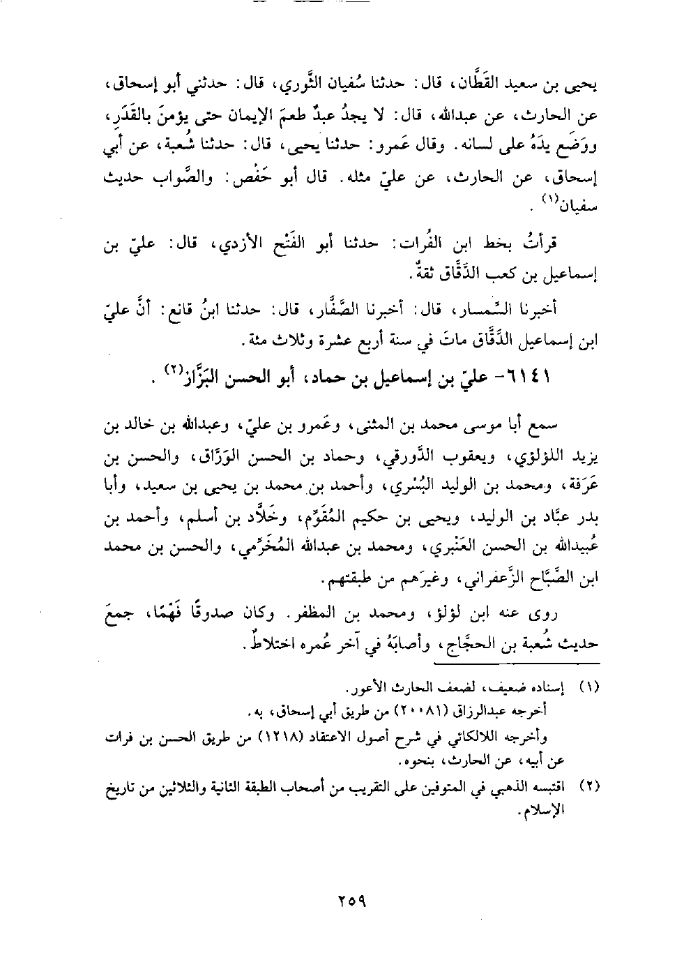 6141 - علي بْن إِسْمَاعِيل بْن حماد أَبُو الحسن البزاز سمع أبا مُوسَى مُحَمَّد بْن المثنى، وعمرو بْن علي، وعبد اللَّه بْن خالد بْن يزيد اللؤلؤي، ويعقوب الدورقي، وحماد بْن الحسن الوراق، والحسن بْن عرفة، ومحمد بْن الوليد البسري، وأحمد بْن مُحَمَّد بْن يَحْيَى بْن سعيد، وأبا بدر عباد بْن الوليد، ويحيى بْن حكيم المقوم، وخلاد بْن أسلم، وأحمد بْن عُبَيْد اللَّه بْن الحسن العنبري، ومحمد بْن عَبْد اللَّه المخرمي، والحسن بْن مُحَمَّد الصباح الزعفراني، وغيرهم من طبقتهم.
