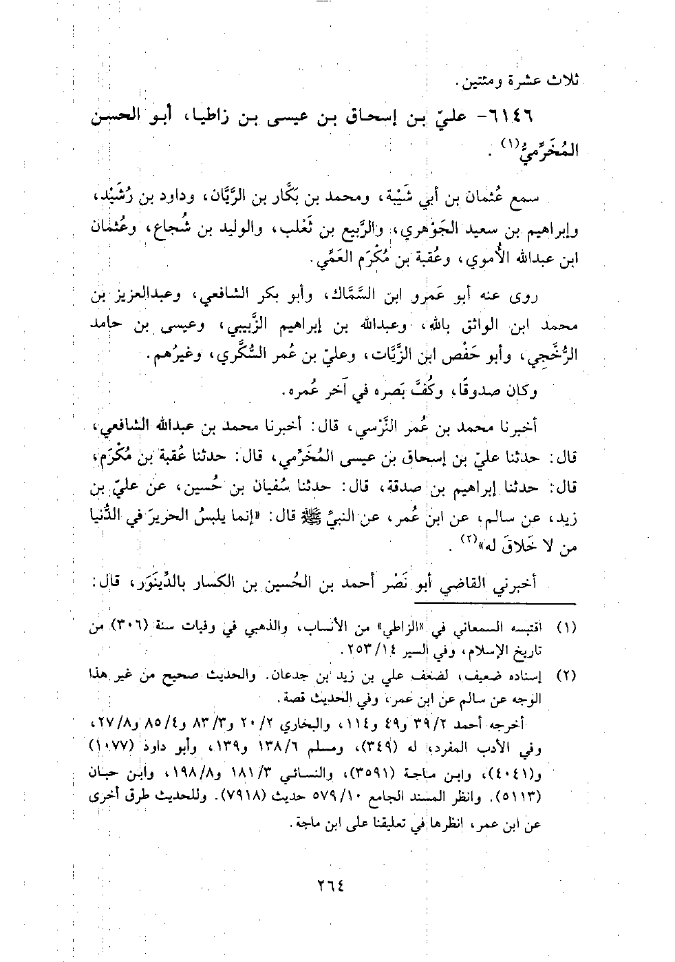 6146 - علي بْن إِسْحَاق بْن عيسى بْن زاطيا أَبُو الحسن المخرمي سمع عُثْمَان بْن أَبِي شيبة، ومحمد بْن بكار بْن الريان، وداود بْن رشيد، وإبراهيم بْن سعيد الجوهري، والربيع بْن ثعلب، والوليد بْن شجاع، وعثمان بْن عَبْد اللَّه الأموي، وعقبة بْن مكرم العمي.