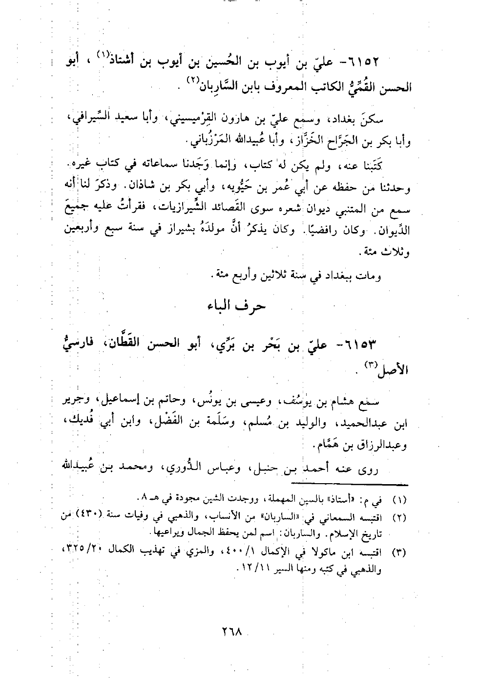 6152 - علي بْن أيوب بْن الحسين بْن أيوب بْن أشتاذ أَبُو الحسن القمي الكاتب المعروف بابن الساربان سكن بَغْدَاد وسمع علي بْن هارون القرميسيني، وأبا سعيد السيرافي، وأبا بكر بْن الجراح الخزاز، وأبا عبيد اللَّه المرزباني.
