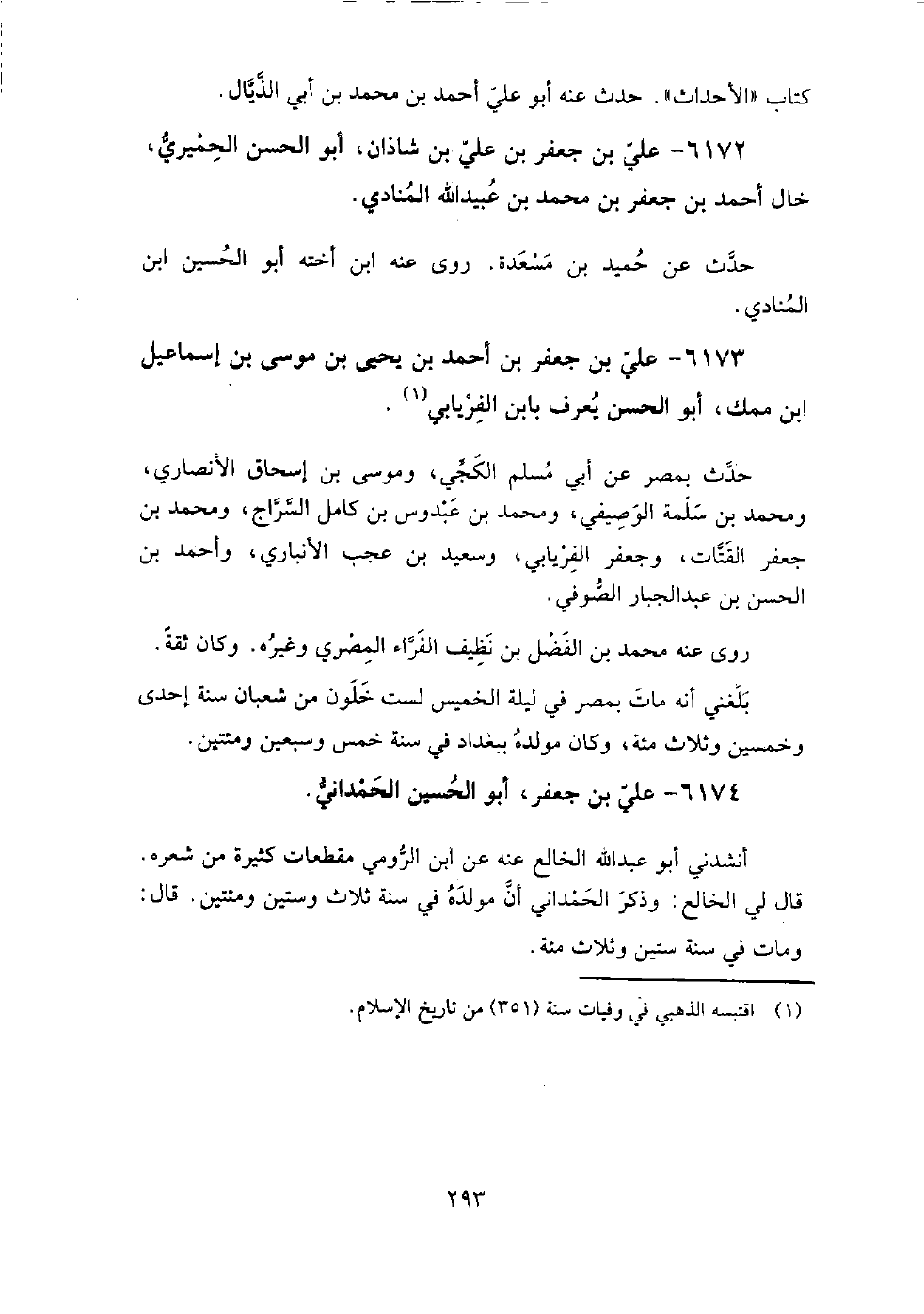 6174 - علي بْن جعفر أَبُو الحسين الحمداني أنشدني أَبُو عَبْد اللَّه الخالع عنه، عَن ابْن الرومي مقطعات كثيرة من شعره.