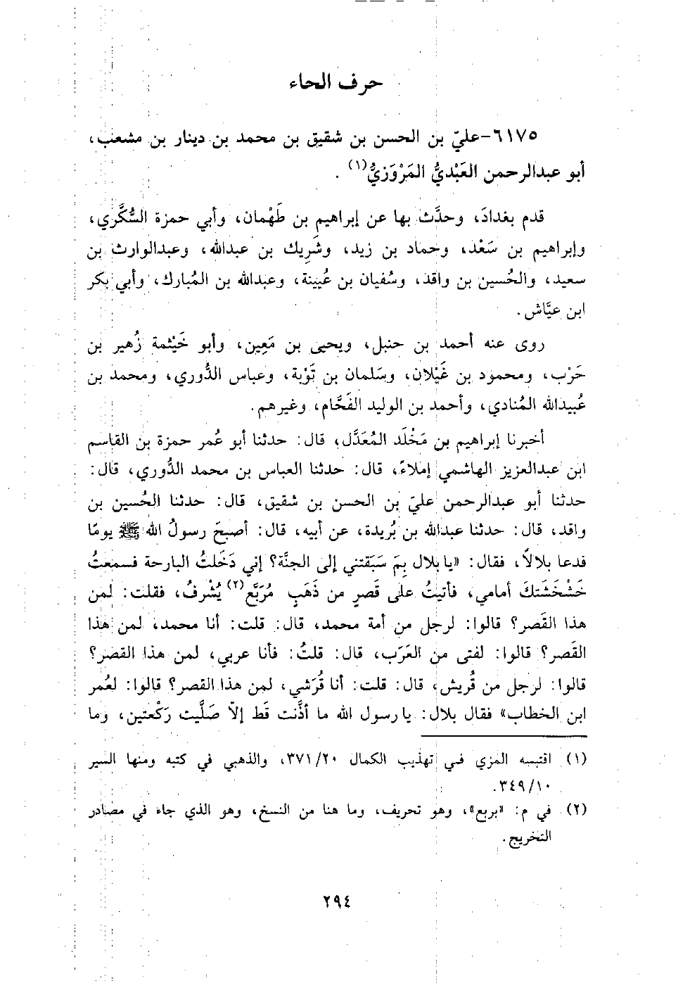 (3884) -[13: 294] أَخْبَرَنَا إِبْرَاهِيمُ بْنُ مَخْلَدِ الْمُعَدَّلِ قَالَ: حَدَّثَنَا أَبُو عُمَرَ حَمْزَةُ بْنُ الْقَاسِمِ بْنِ عَبْدِ الْعَزِيزِ الْهَاشِمِيُّ إِمْلاءً، قَالَ: حَدَّثَنَا الْعَبَّاسُ بْنُ مُحَمَّدٍ الدُّورِيُّ، قَالَ: حَدَّثَنَا أَبُو عَبْدِ الرَّحْمَنِ عَلِيُّ بْنُ الْحَسَنِ بْنِ شَقِيقٍ، قَالَ: حَدَّثَنَا الْحُسَيْنُ بْنُ وَاقِدٍ، قَالَ: حَدَّثَنَا عَبْدُ اللَّهِ بْنُ بُرَيْدَةَ، عَنْ أَبِيهِ، قَالَ: أَصْبَحَ رَسُولُ اللَّهِ صَلَّى اللَّهُ عَلَيْهِ وَسَلَّمَ يَوْمًا، فَدَعَا بِلالا، فَقَالَ: " يَا بِلالُ بِمَ سَبَقْتَنِي إِلَى الْجَنَّةِ؟ إِنِّي دَخَلْتُ الْبَارِحَةَ، فَسَمِعْتُ خَشْخَشَتَكَ أَمَامِي، فَأَتَيْتُ عَلَى قَصْرٍ مِنْ ذَهَبٍ مُرَبَّعٍ يُشْرِفُ، فَقُلْتُ: لِمَنْ هَذَا الْقَصْرِ؟، قَالُوا: لِرَجُلٍ مِنْ أُمَّةِ مُحَمَّدٍ، قَالَ: قُلْتُ: أَنَا مُحَمَّدٌ، لِمَنْ هَذَا الْقَصْرِ؟، قَالُوا: لِفَتًى مِنَ الْعَرَبِ، قَالَ: قُلْتُ: فَأَنَا عَرَبِيٌّ، لِمَنْ هَذَا الْقَصْرِ؟، قَالُوا: لِرَجُلٍ مِنْ قُرَيْشٍ، قَالَ: قُلْتُ: أَنَا قُرَشِيٌّ، لِمَنْ هَذَا الْقَصْرِ؟، قَالُوا: لِعُمَرَ بْنِ الْخَطَّابِ "؟، فَقَالَ بِلالٌ: مَا أَذَّنْتُ قَطُّ إِلا صَلَّيْتُ رَكْعَتَيْنِ، وَمَا أَصَابَنِي حَدَثٌ قَطُّ، إِلا تَوَضَّأْتُ عِنْدَهَا فَقَالَ: بِهَذَا ذكر مُحَمَّد بْن أَبِي الفوارس أن مُحَمَّد بْن حميد المخرمي أخبرهم، قَالَ: حَدَّثَنَا علي بْن الحسين بْن حبان، قَالَ: وجدت فِي كتاب أَبِي بخط يده: قَالَ أَبُو زكريا وما أعلم أحدا قدم علينا من خراسان كان أفضل من ابن شقيق، وكانوا كتبوا فِي أمره كتابا أنه يرى الإرجاء فقلنا له: فقال: لا أجعلكم فِي حل.
