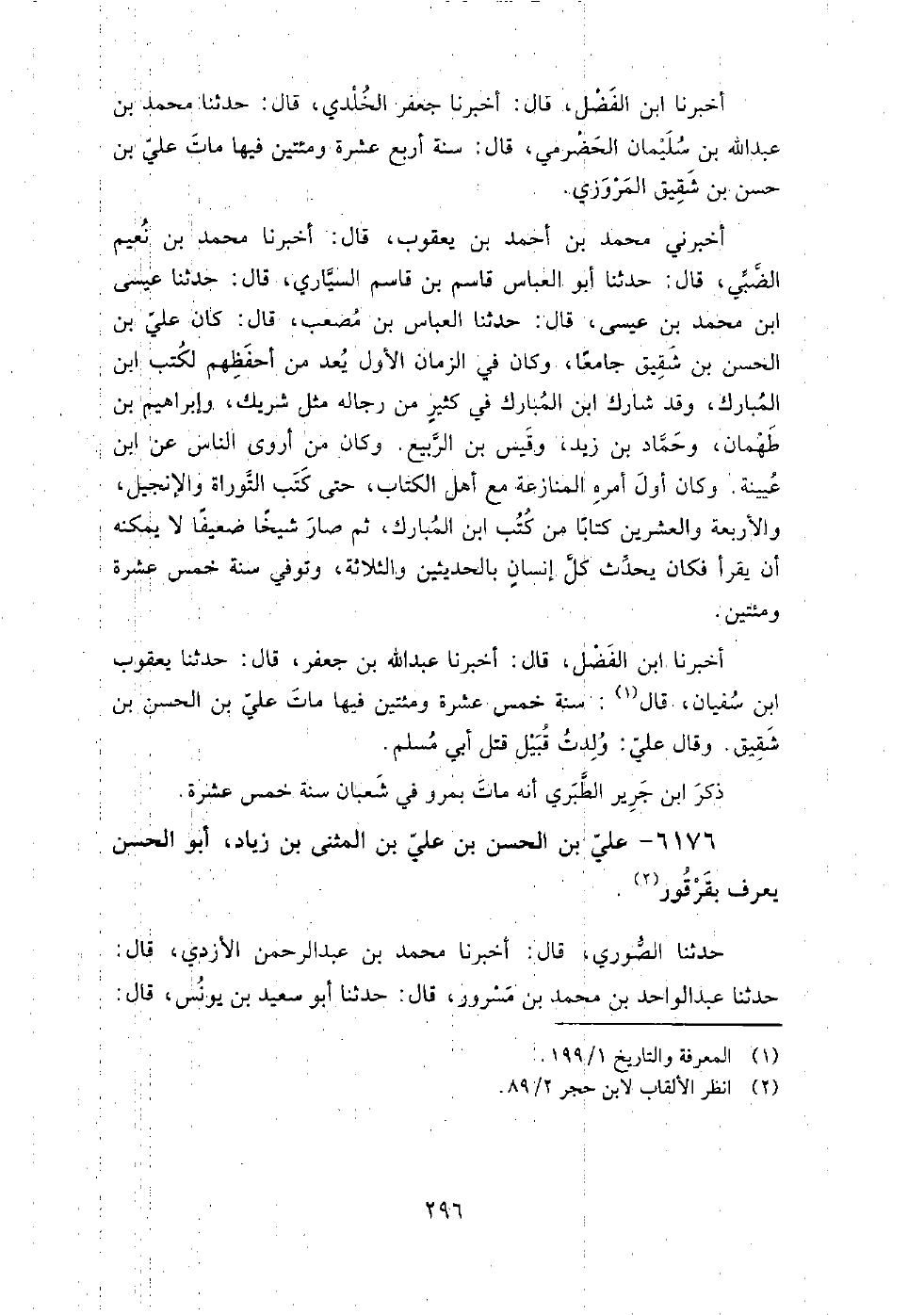 6176 - علي بْن الحسن بْن علي بْن المثنى بْن زياد أَبُو الحسن يعرف بقرقور حَدَّثَنَا الصوري، قَالَ: أَخْبَرَنَا مُحَمَّد بْن عَبْد الرَّحْمَن الأزدي، قَالَ: حَدَّثَنَا عَبْد الواحد بْن مُحَمَّد بْن مسرور، قَالَ: حَدَّثَنَا أَبُو سعيد بْن يونس، قَالَ: علي بْن الحسن بْن علي بْن المثنى بْن زياد، يكنى أبا الحسن، يعرف بقرقور، بغدادي، قدم مصر، وكتب عنه، توفي بدميرة من أسفل أرض مصر فِي شهر ربيع الآخر سنة تسع وخمسين ومائتين