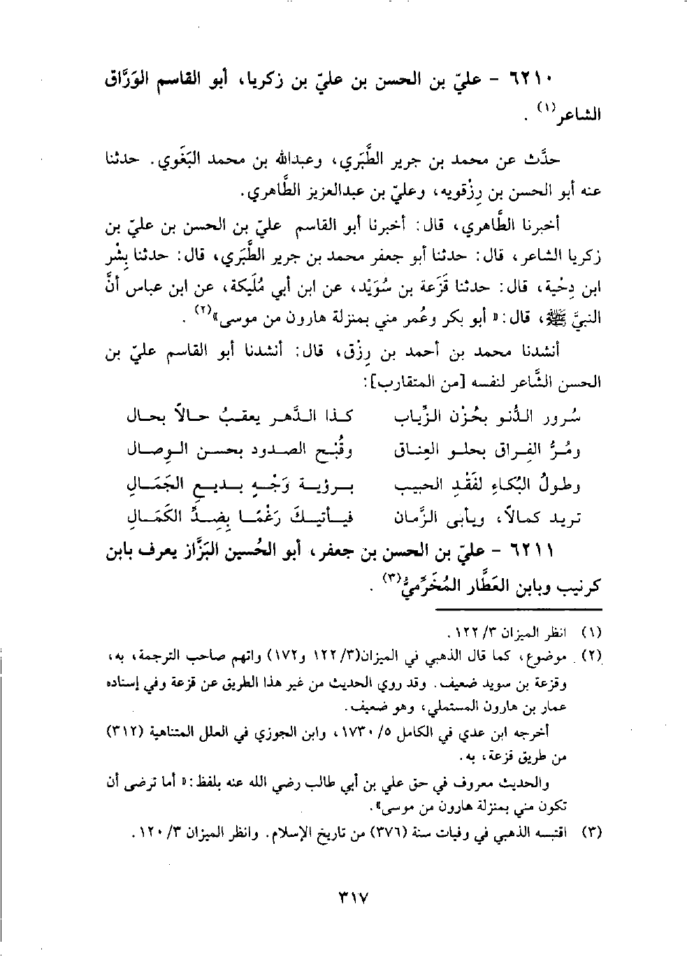 6210 - علي بْن الحسن بْن علي بْن زكريا، أَبُو القاسم الوراق الشاعر حدث عَن مُحَمَّد بْن جرير الطبري، وعبد اللَّه بْن مُحَمَّد البغوي.