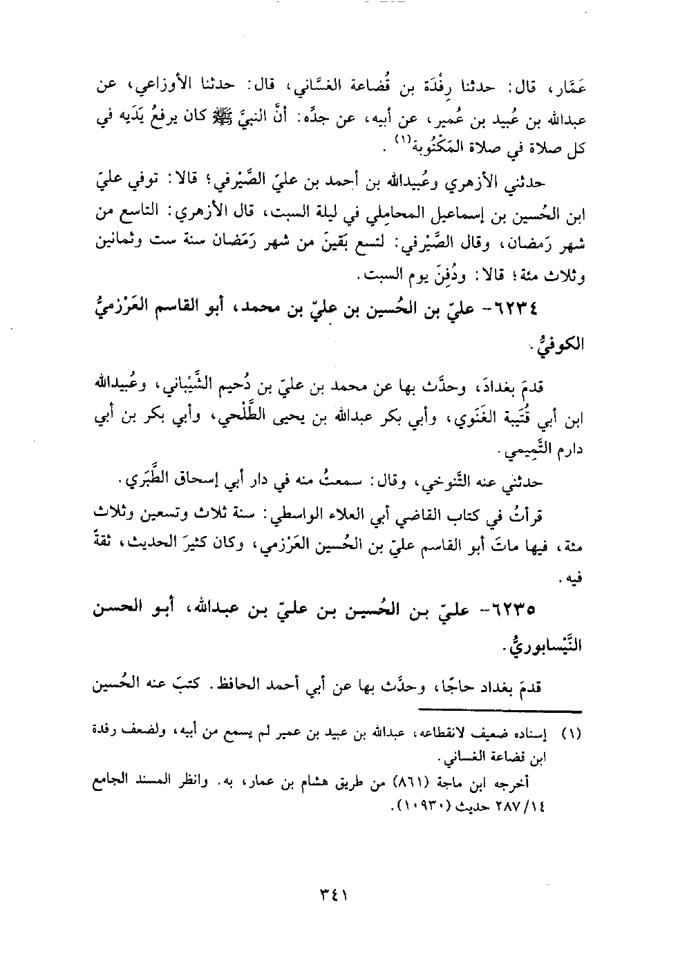 6234 - علي بْن الحسين بْن علي بْن مُحَمَّد، أَبُو القاسم العرزمي الكوفي قدم بَغْدَاد، وحدث بها عَن مُحَمَّد بْن علي بْن دحيم الشيباني، وعبيد اللَّه بْن أَبِي قتيبة الغنوي، وأبي بكر عَبْد اللَّه بْن يَحْيَى الطلحي، وأبي بكر بْن أَبِي دارم التميمي.