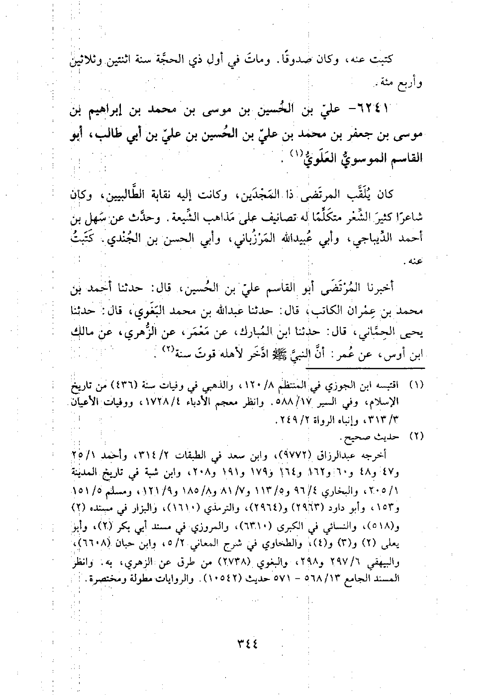(3924) -[13: 344] أَخْبَرَنَا الْمُرْتَضِي أَبُو الْقَاسِمِ عَلِيُّ بْنُ الْحُسَيْنِ، قَالَ: حَدَّثَنَا أَحْمَدُ بْنُ مُحَمَّدِ بْنِ عِمْرَانَ الْكَاتِبُ، قَالَ: حَدَّثَنَا عَبْدُ اللَّهِ بْنُ مُحَمَّدٍ الْبَغَوِيُّ، قَالَ: حَدَّثَنَا يَحْيَى الْحِمَّانِيُّ، قَالَ: حَدَّثَنَا ابْنُ الْمُبَارَكِ، عَنْ مَعْمَرٍ، عَنِ الزُّهْرِيِّ، عَنْ مَالِكِ بْنِ أَوْسٍ، عَنْ عُمَرَ: " أَنَّ النَّبِيَّ صَلَّى اللَّهُ عَلَيْهِ وَسَلَّمَ ادَّخَرَ لأَهْلِهِ قُوتَ سَنَةٍ " سمعت التنوخي، يَقُولُ: مولد المرتضي أَبِي القاسم الموسوي فِي سنة خمس وخمسين وثلاث مائة.
