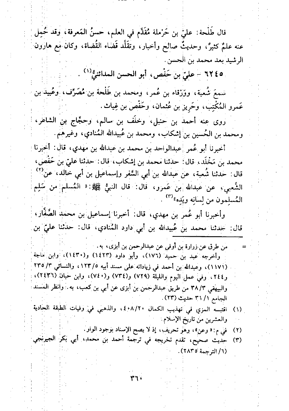 (3926) -[13: 360] أَخْبَرَنَا أَبُو عُمَرَ عَبْدُ الْوَاحِدِ بْنُ مُحَمَّدِ بْنِ مَهْدِيٍّ، قَالَ: أَخْبَرَنَا مُحَمَّدُ بْنُ مَخْلَدٍ، قَالَ: حَدَّثَنَا مُحَمَّدُ بْنُ إِشْكَابَ، قَالَ: حَدَّثَنَا عَلِيُّ بْنُ حَفْصٍ، قَالَ: حَدَّثَنَا شُعْبَةُ، عَنْ عَبْدِ اللَّهِ بْنِ أَبِي السَّفَرِ وَإِسْمَاعِيلُ بْنُ أَبِي خَالِدٍ، عَنِ الشَّعْبِيِّ، عَنْ عَبْدِ اللَّهِ بْنِ عَمْرٍو، قَالَ: قَالَ النَّبِيُّ صَلَّى اللَّهُ عَلَيْهِ وَسَلَّمَ: " الْمُسْلِمُ مَنْ سَلِمَ الْمُسْلِمُونَ مِنْ لِسَانِهِ وَيَدِهِ " وأَخْبَرَنَا أَبُو عُمَر بْن مهدي، قَالَ: أَخْبَرَنَا إِسْمَاعِيل بْن مُحَمَّد الصفار، قَالَ: حَدَّثَنَا مُحَمَّد بْن عبيد اللَّه بْن أَبِي داود المنادي، قَالَ: حَدَّثَنَا علي بْن حفص المدائني، وكان أَحْمَد يحبه حبا شديدا أَخْبَرَنَا البرقاني، قَالَ: أَخْبَرَنَا أَبُو أَحْمَد الحسين بْن علي التميمي، قَالَ: حَدَّثَنَا أَبُو عوانة يعقوب بْن إِسْحَاق الإسفراييني، قَالَ: حَدَّثَنَا أَبُو بكر المروذي، قَالَ: قَالَ أَحْمَد بْن حنبل: علي بْن حفص أحب إلي من شبابة أَخْبَرَنَا العتيقي، قَالَ: أَخْبَرَنَا مُحَمَّد بْن عدي البصري، فِي كتابه، قَالَ: حَدَّثَنَا أَبُو عبيد مُحَمَّد بْن علي الآجري، قَالَ: سئل أَبُو داود، عَن علي بْن حفص، فقال: ثقة قَالَ لي الحسن بْن علي قَالَ لي أَحْمَد بْن حنبل: اكتب عَن علي بْن حفص حديث حريز، قَالَ: فوجدت يزيد أروى منه أَخْبَرَنَا أَبُو بكر أَحْمَد بْن مُحَمَّد الأشناني، قَالَ: سمعت أَحْمَد بْن مُحَمَّد بْن عبدوس الطرائفي، يَقُولُ: سمعت عُثْمَان بْن سعيد الدرامي، يَقُولُ: قلت: يعني ليحيى بْن معين فعلي بْن حفص، حَدَّثَنَا عنه خلف المخرمي؟ فقال: المدائني ليس به بأس حَدَّثَنَا الصوري، قَالَ: أَخْبَرَنَا الخصيب بْن عَبْد اللَّه، القاضي بمصر، قَالَ: أَخْبَرَنَا عَبْد الكريم بْن أَحْمَد بْن شعيب النسائي، قَالَ: أَخْبَرَنِي أَبِي، قَالَ أَبُو الحسن: علي بْن حفص المدائني ليس به بأس.