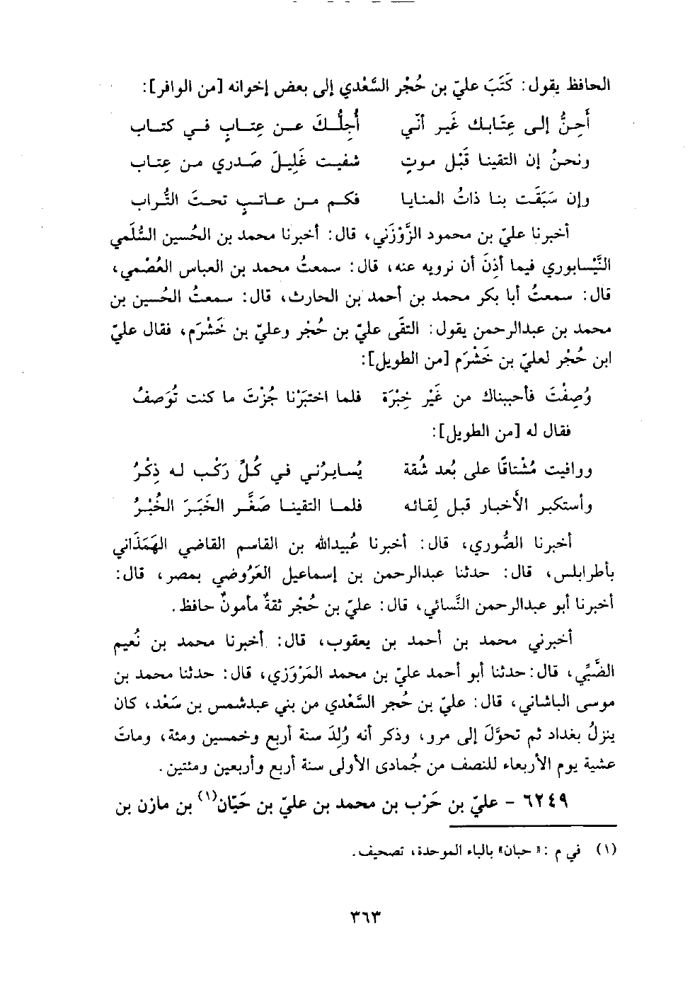 6249 - علي بْن حرب بْن مُحَمَّد بْن علي بْن حيان بْن مازن بْن الغضوبة أَبُو الحسن الطائي الموصلي ذكر أن مازن بْن الغضوبة وفد على النَّبِيّ صَلَّى اللَّهُ عَلَيْهِ وَسَلَّمَ وأما علي، فإنه كان أحد من رحل فِي الحديث إِلَى الحجاز وبغداد والكوفة والبصرة، ورأى المعافى بْن عمران، إلا أنه لم يسمع منه، وسمع عُمَر بْن أيوب الموصلي، وزيد بْن أَبِي الزرقاء، وقاسم بْن يزيد الجرمي، وأبا مسعود الزجاج، وسفيان بْن عيينة، وأبا ضمرة أنس بْن عياض، وعبد اللَّه بْن وهب، وعبد اللَّه بْن إدريس، ومحمد بْن فضيل، وحفص بْن غياث، ووكيعا، وأبا معاوية، وعبد اللَّه بْن نمير، وعبد اللَّه بْن داود الخريبي، وأبا عامر العقدي، وأبا عاصم الشيباني، وشبابة بْن سوار، ويزيد بْن هارون، وروح بْن عبادة، ووهب بْن جرير، وأحمد بْن حنبل.