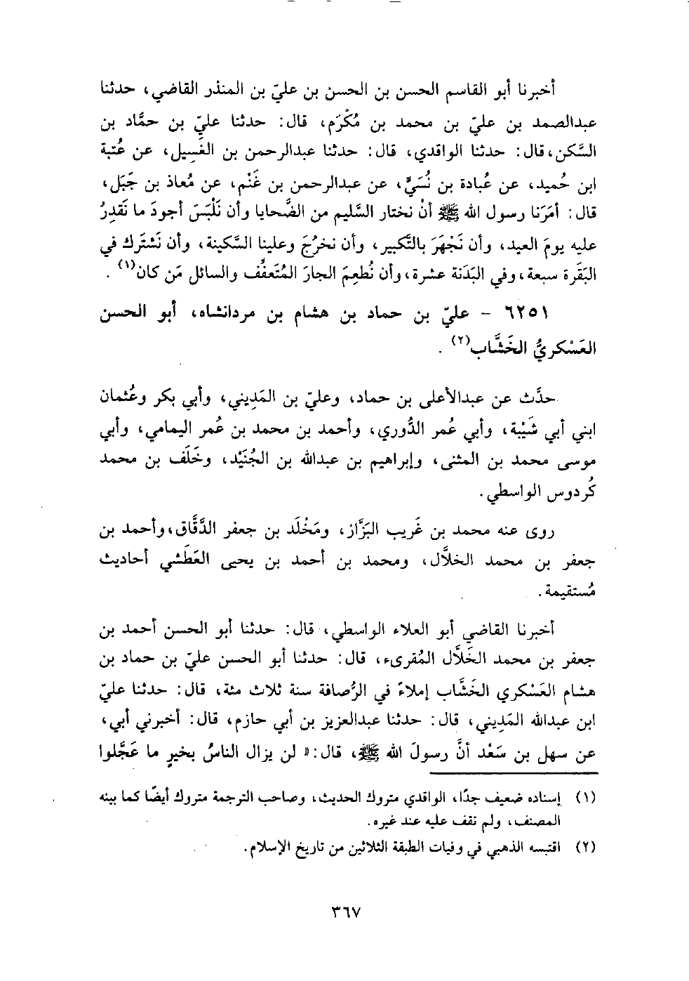 6251 - علي بْن حماد بْن هشام بْن مردانشاه أَبُو الحسن العسكري الخشاب حدث عَن عَبْد الأعلى بْن حماد، وعلي ابْن المديني، وأبي بكر، وعثمان ابني أَبِي شيبة، وأبي عُمَر الدوري، وأحمد بْن مُحَمَّد بْن عُمَر اليمامي، وأبي مُوسَى مُحَمَّد بْن المثنى، وإبراهيم بْن عَبْد اللَّه بْن الجنيد، وخلف بْن مُحَمَّد كردوس الواسطي.