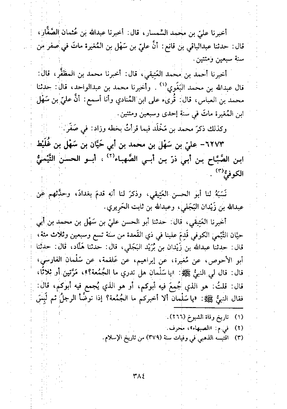 (3942) -[13: 384] أَخْبَرَنَا الْعَتِيقِيُّ، قَالَ: حَدَّثَنَا أَبُو الْحَسَنِ عَلِيُّ بْنُ سَهْلِ بْنِ مُحَمَّدِ بْنِ أَبِي حَيَّانَ التَّيْمِيُّ الْكُوفِيُّ، قَدِمَ عَلَيْنَا فِي ذِي الْقَعْدَةِ مِنْ سَنَةِ تِسْعٍ وَسَبْعِينَ وَثَلاثِ مِائَةٍ، قَالَ: حَدَّثَنَا عَبْدُ اللَّهِ بْنُ زَيْدَانَ بْنِ بُرَيْدٍ الْبَجَلِيُّ، قَالَ: حَدَّثَنَا هَنَّادٌ، قَالَ: حَدَّثَنَا أَبُو الأَحْوَصِ، عَنْ مُغِيرَةَ، عَنْ إِبْرَاهِيمَ، عَنْ عَلْقَمَةَ، عَنْ سَلْمَانَ الْفَارِسِيِّ، قَالَ: قَالَ لِي النَّبِيُّ صَلَّى اللَّهُ عَلَيْهِ وَسَلَّمَ: " يَا سَلْمَانُ هَلْ تَدْرِي مَا الْجُمُعَةُ "؟ مَرَّتَيْنِ أَوْ ثَلاثًا.