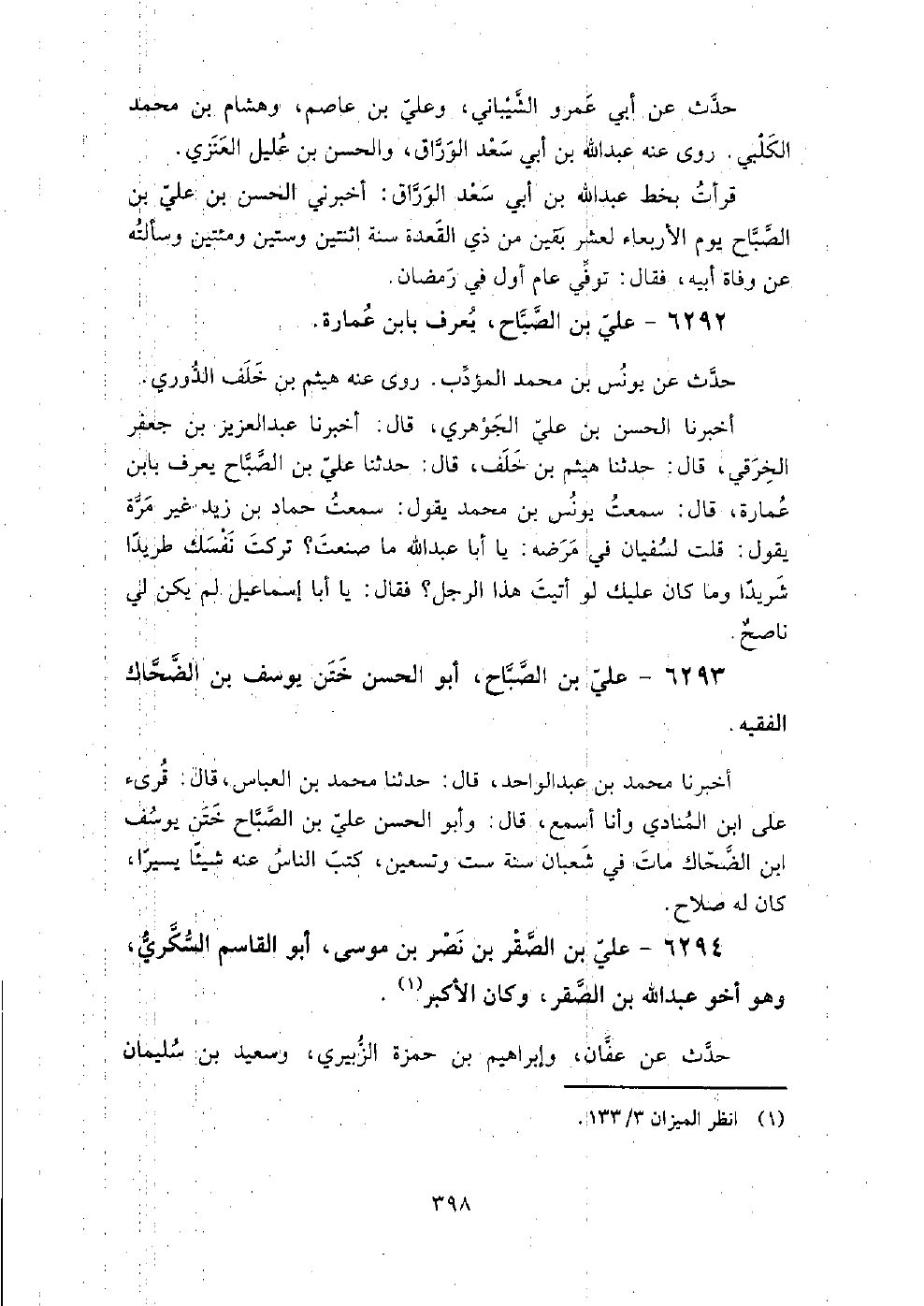 6293 - علي بْن الصباح أَبُو الحسن ختن يُوسُف بْن الضحاك الفقيه أَخْبَرَنَا مُحَمَّد بْن عَبْد الواحد، قَالَ: حَدَّثَنَا مُحَمَّد بْن العباس، قَالَ: قرئ على ابن المنادي، وأنا أسمع، قَالَ: وأبو الحسن علي بْن الصباح ختن يُوسُف بْن الضحاك، مات فِي شعبان سنة ست وتسعين، كتب الناس عنه شيئا يسيرا، كان له صلاح