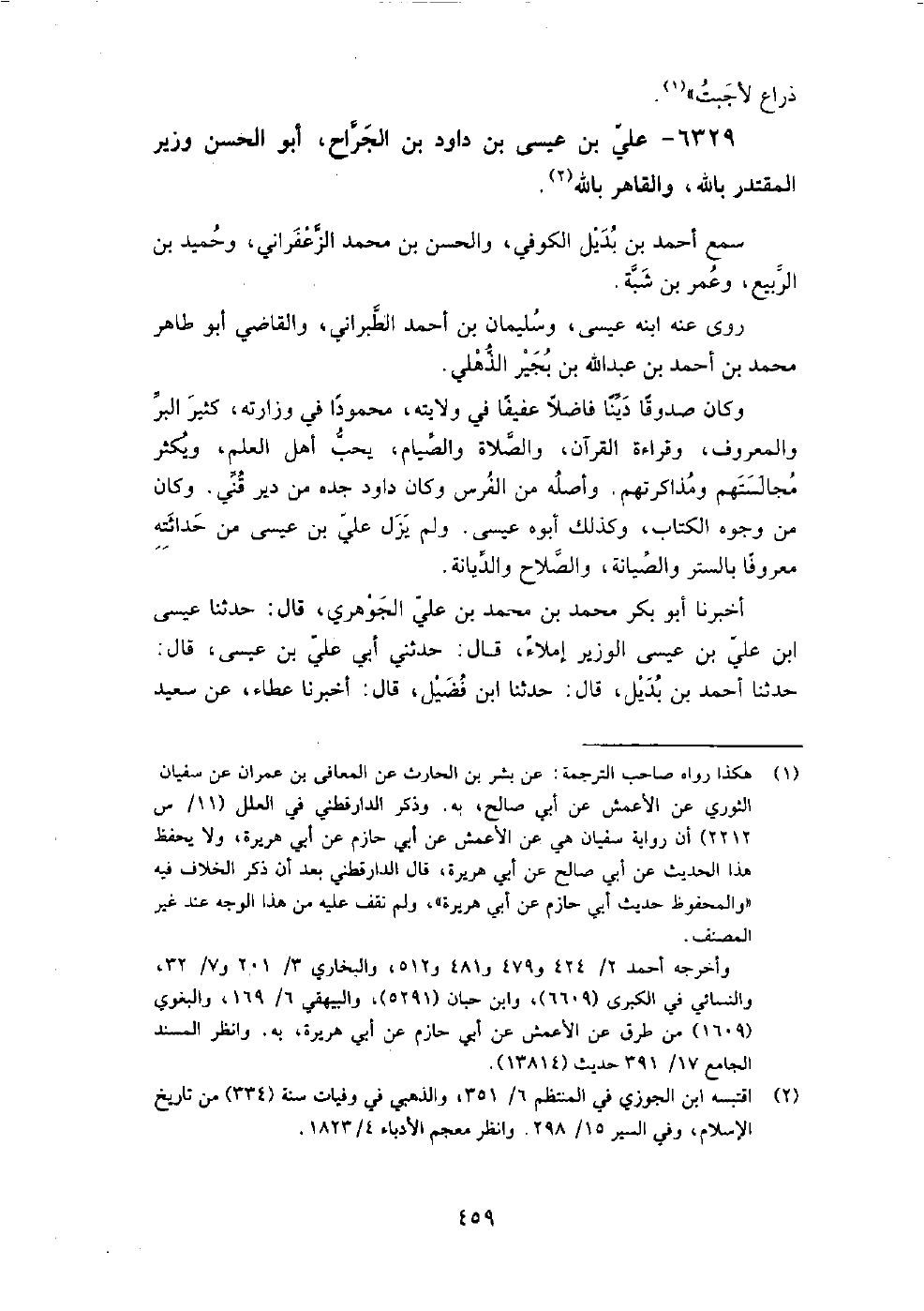 6329 - على بْن عيسى بْن داود بْن الجراح أَبُو الحسن وزير المقتدر بالله والقاهر بالله سمع أَحْمَد بْن بديل الكوفي، والحسن بْن مُحَمَّد الزعفراني، وحميد بْن الربيع، وعمر بْن شبة.