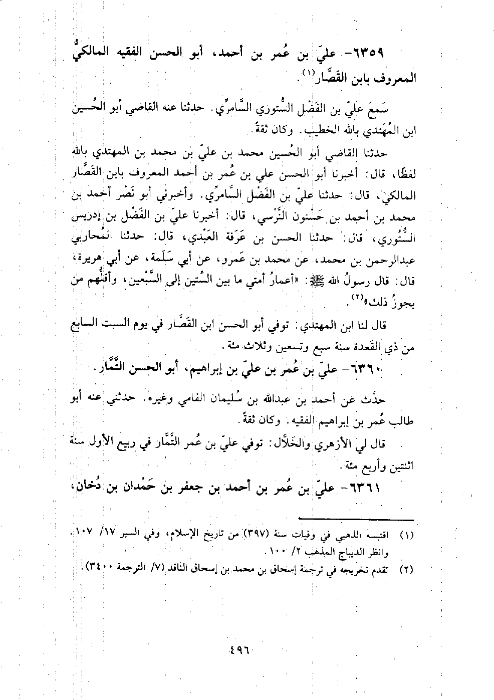 (3992) -[13: 496] حَدَّثَنَا الْقَاضِي أَبُو الْحُسَيْنِ مُحَمَّدُ بْنُ عَلِيِّ بْنِ مُحَمَّدِ بْنِ الْمُهْتَدِي بِاللَّهِ لَفْظًا، قَالَ: أَخْبَرَنَا أَبُو الْحَسَنِ عَلِيُّ بْنُ عُمَرَ بْنِ أَحْمَدَ الْمَعْرُوفُ بِابْن الْقَصَّارِ الْمَالِكِيِّ، قَالَ: حَدَّثَنَا عَلِيُّ بْنُ الْفَضْلِ السَّامَرِّيُّ.