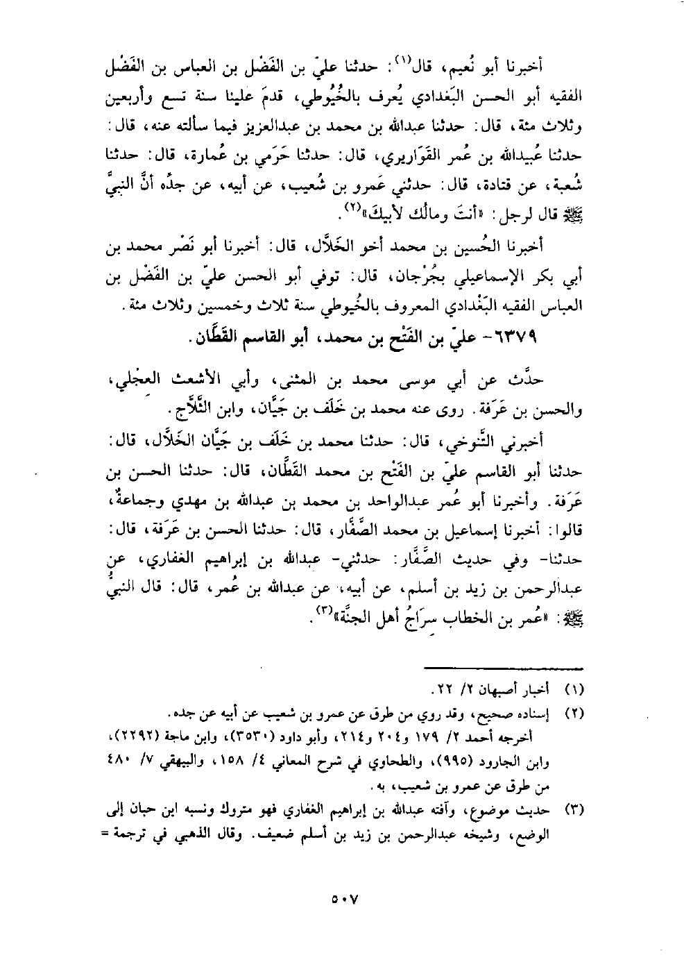 (4001) -[13: 507] أَخْبَرَنِي التَّنُوخِيُّ، قَالَ: حَدَّثَنَا مُحَمَّدُ بْنُ خَلَفِ بْنِ جَيَّانَ الْخَلالُ، قَالَ: حَدَّثَنَا أَبُو الْقَاسِمِ عَلِيُّ بْنُ الْفَتْحِ بْنِ مُحَمَّدٍ الْقَطَّانُ، قَالَ: حَدَّثَنَا الْحَسَنُ بْنُ عَرَفَةَ.
