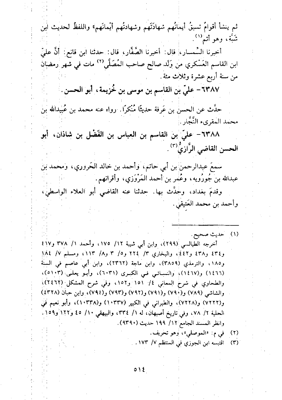 6387 - علي بْن القاسم بْن مُوسَى بْن خزيمة أَبُو الحسن حدث عَن الحسن بْن عرفة حديثا منكرا رواه عنه مُحَمَّد بْن عبيد اللَّه بْن مُحَمَّد المقرئ النجار