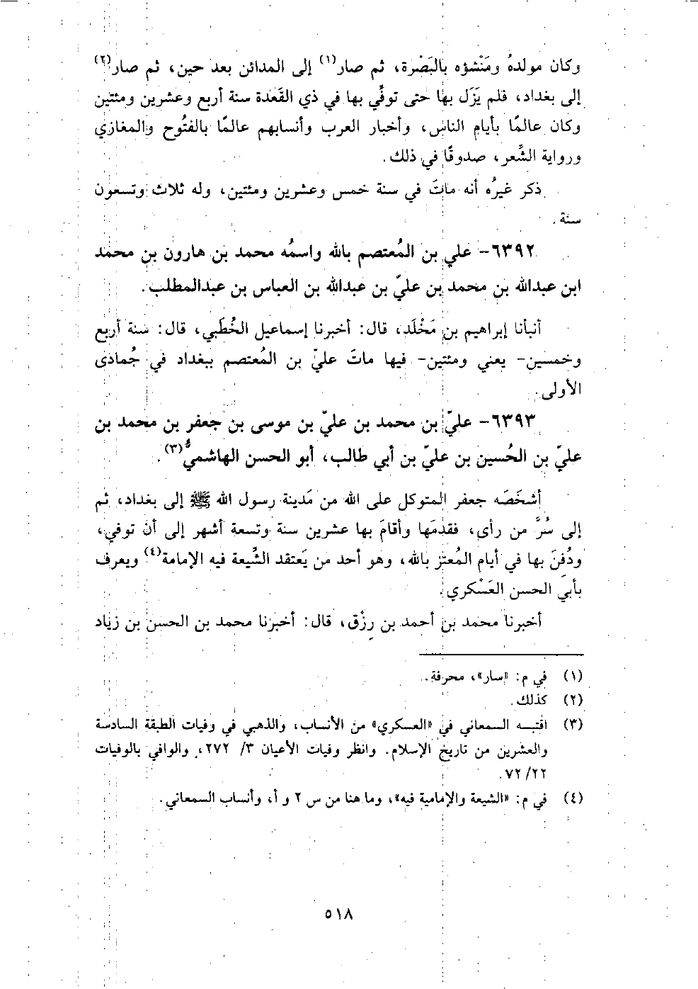 6393 - علي بن محمد بن علي بن موسى بن جعفر بن محمد بن علي بن الحسين بن علي بن أبي طالب أبو الحسن الهاشمي أشخصه جعفر المتوكل على الله من مدينة رَسُول اللَّهِ صَلَّى اللَّهُ عَلَيْهِ وَسَلَّمَ إِلَى بَغْدَاد، ثم إِلَى سر من رأى، فقدمها، وأقام بها عشرين سنة وتسعة أشهر إِلَى أن توفي، ودفن بها فِي أيام المعتز بالله، وهو أحد من يعتقد الشيعة فيه الإمامة، ويعرف بأبي الحسن العسكري.