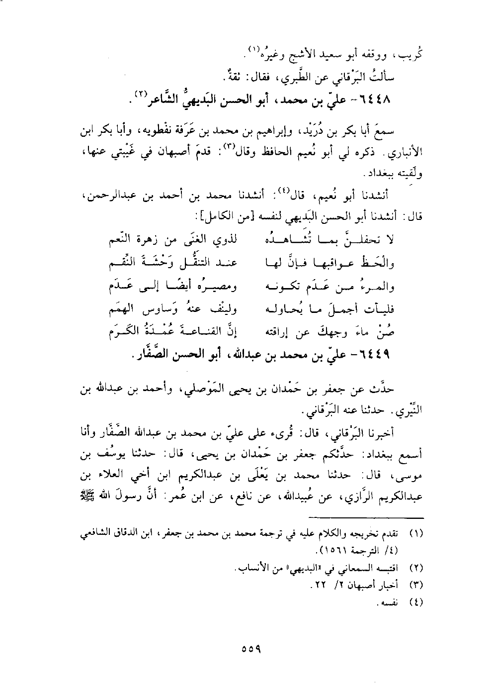 أنشدنا أَبُو نعيم، قَالَ: أنشدنا مُحَمَّد بْن أَحْمَد بْن عَبْد الرَّحْمَن، قَالَ: أنشدنا أَبُو الحسن البديهي لنفسه