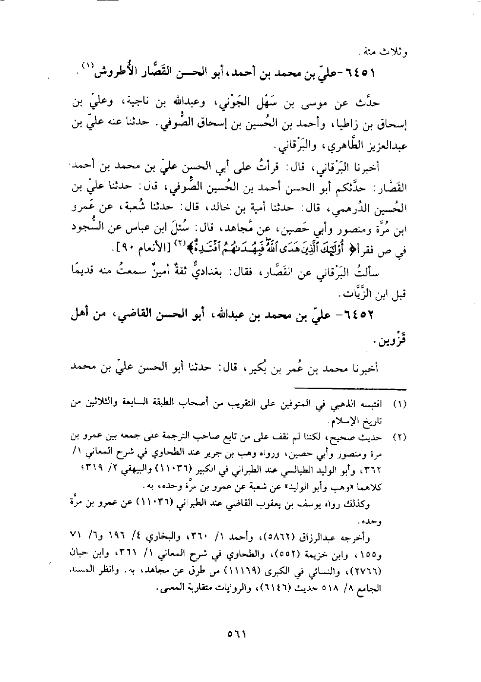 أَخْبَرَنَا البرقاني، قَالَ: قرأت على أَبِي الحسن علي بْن مُحَمَّد بْن أَحْمَد القصار: حدثكم أَبُو الحسن أَحْمَد بْن الحسين الصوفي، قَالَ: حَدَّثَنَا علي بْن الحسين الدرهمي، قَالَ: حَدَّثَنَا أمية بْن خالد، قَالَ: حَدَّثَنَا شعبة، عَن عَمْرو بْن مرة، ومنصور، وأبي حصين، عَن مجاهد، قَالَ: سئل ابن عباس عَن السجود فِي ص فقرأ: {أُولَئِكَ الَّذِينَ هَدَى اللَّهُ فَبِهُدَاهُمُ اقْتَدِهْ} سألت البرقاني عَن القصار، فقال: بغدادي ثقة أمين سمعت منه قديما قبل ابن الزيات.
