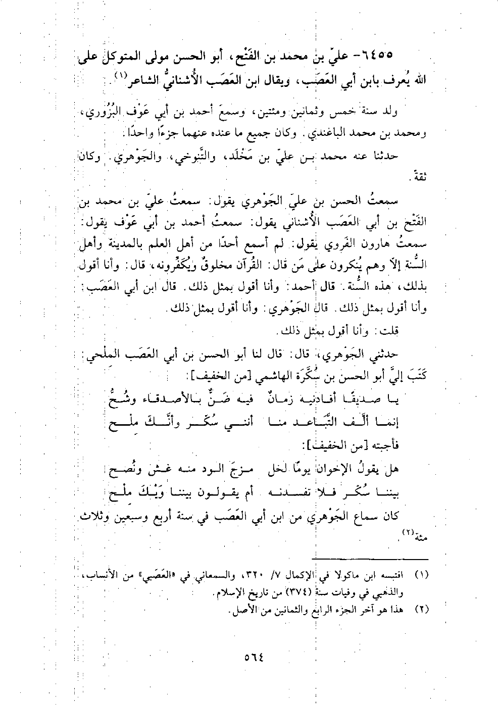 6455 - علي بْن مُحَمَّد بْن الفتح أَبُو الحسن مولى المتوكل على اللَّه يعرف بابن أَبِي العصب ويقال ابْن العصب الأشناني الشاعر ولد فِي سنة خمس وثمانين ومائتين، وسمع أحمد بْن أَبِي عوف البزوري، ومحمد بْن مُحَمَّد الباغندي، وكان جميع ما عنده عنهما جزءا واحدا.