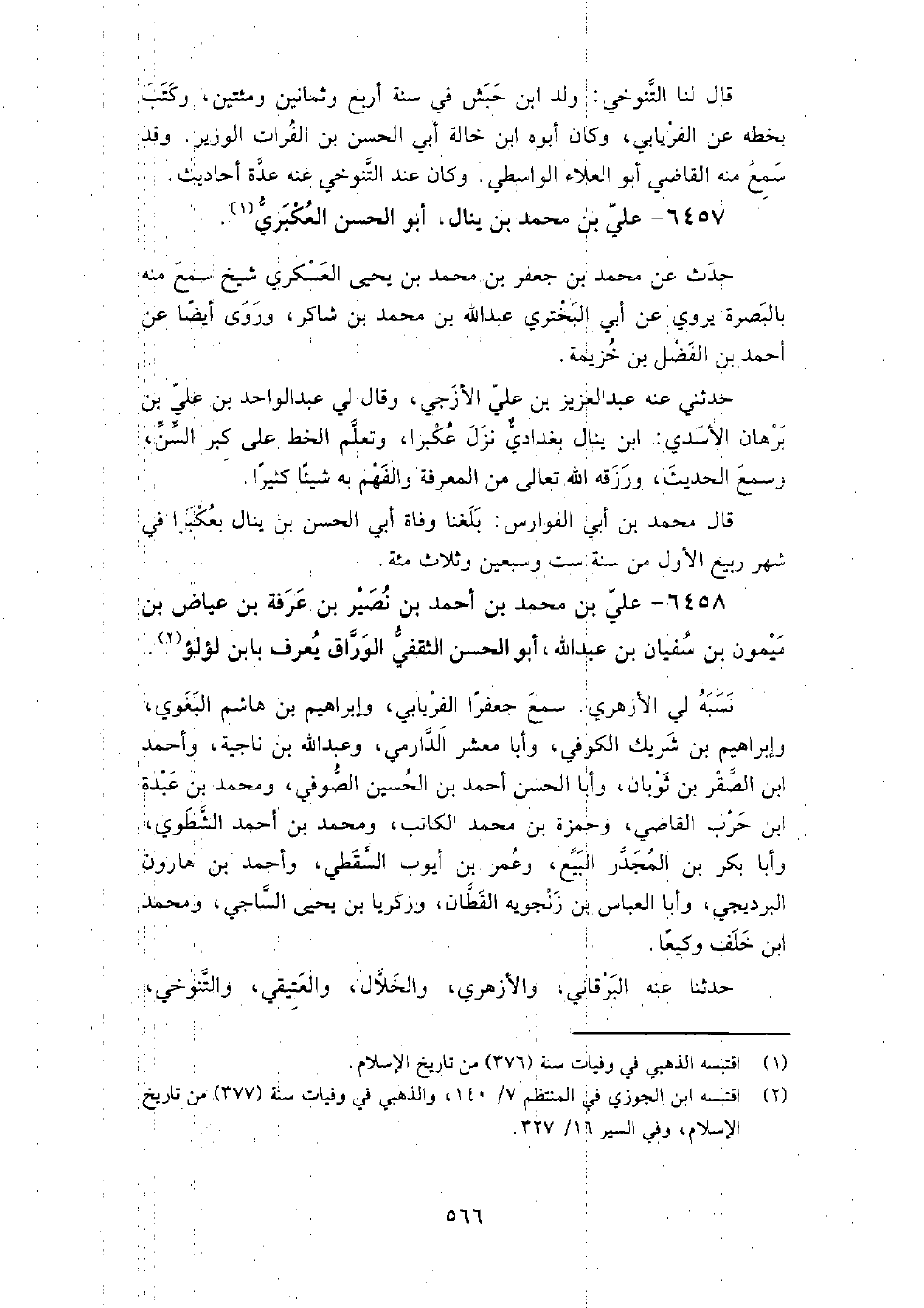 6458 - علي بْن مُحَمَّد بْن أَحْمَد بْن نصير بْن عرفة بْن عياض بْن ميمون بْن سُفْيَان بْن عَبْد اللَّه أَبُو الحسن الثقفي الوراق يعرف بابن لؤلؤ نسبه لي الزهري، سمع جعفرا الفريابي، وإبراهيم بْن هاشم البغوي، وإبراهيم بْن شريك الكوفي، وأبا معشر الدارمي، وعبد اللَّه بْن ناجية، وأحمد بْن الصقر بْن ثوبان، وأبا الحسن أَحْمَد بْن الحسين الصوفي، ومحمد بْن عبدة بْن حرب القاضي، وحمزة بْن مُحَمَّد الكاتب، ومحمد بْن أَحْمَد الشطوي، وأبا بكر بْن المجدر البيع، وعمر بْن أيوب السقطي، وأحمد بْن هارون البرديجي، وأبا العباس بْن زنجويه القطان، وزكريا بْن يَحْيَى الساجي، ومحمد بْن خلف وكيعا.