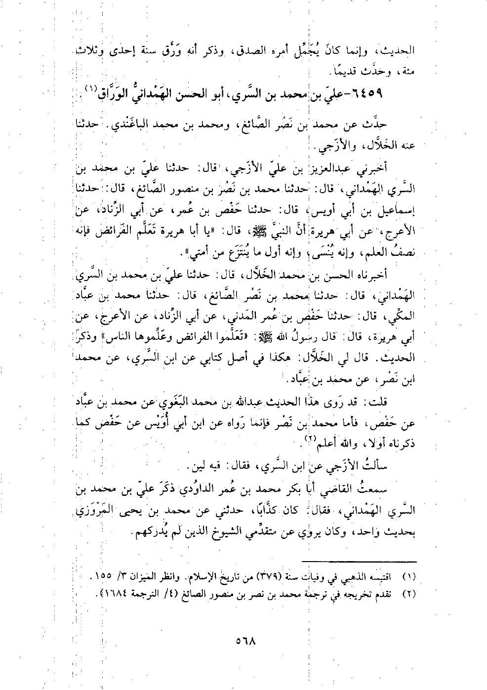 6459 - علي بْن مُحَمَّد بْن السري أَبُو الحسن الهمداني الوراق حدث عَن مُحَمَّد بْن نصر الصائغ، ومحمد بْن مُحَمَّد الباغندي.