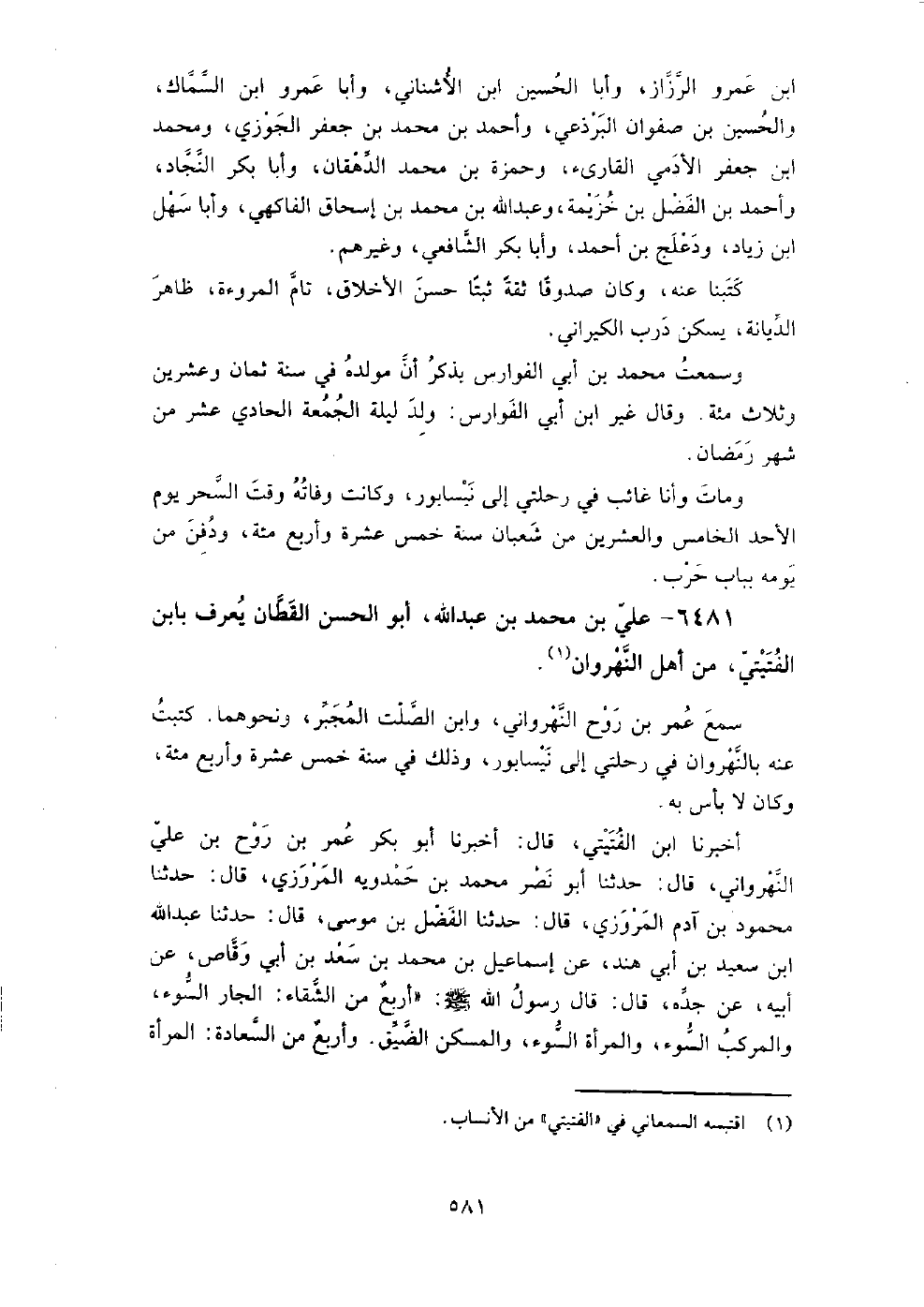 6481 - علي بْن مُحَمَّد بْن عَبْد اللَّه أَبُو الحسن القطان يعرف بابن الفتيتي من أهل النهروان سمع عَمْرو بْن روح النهرواني، وابن الصلت المجبر، ونحوهما.