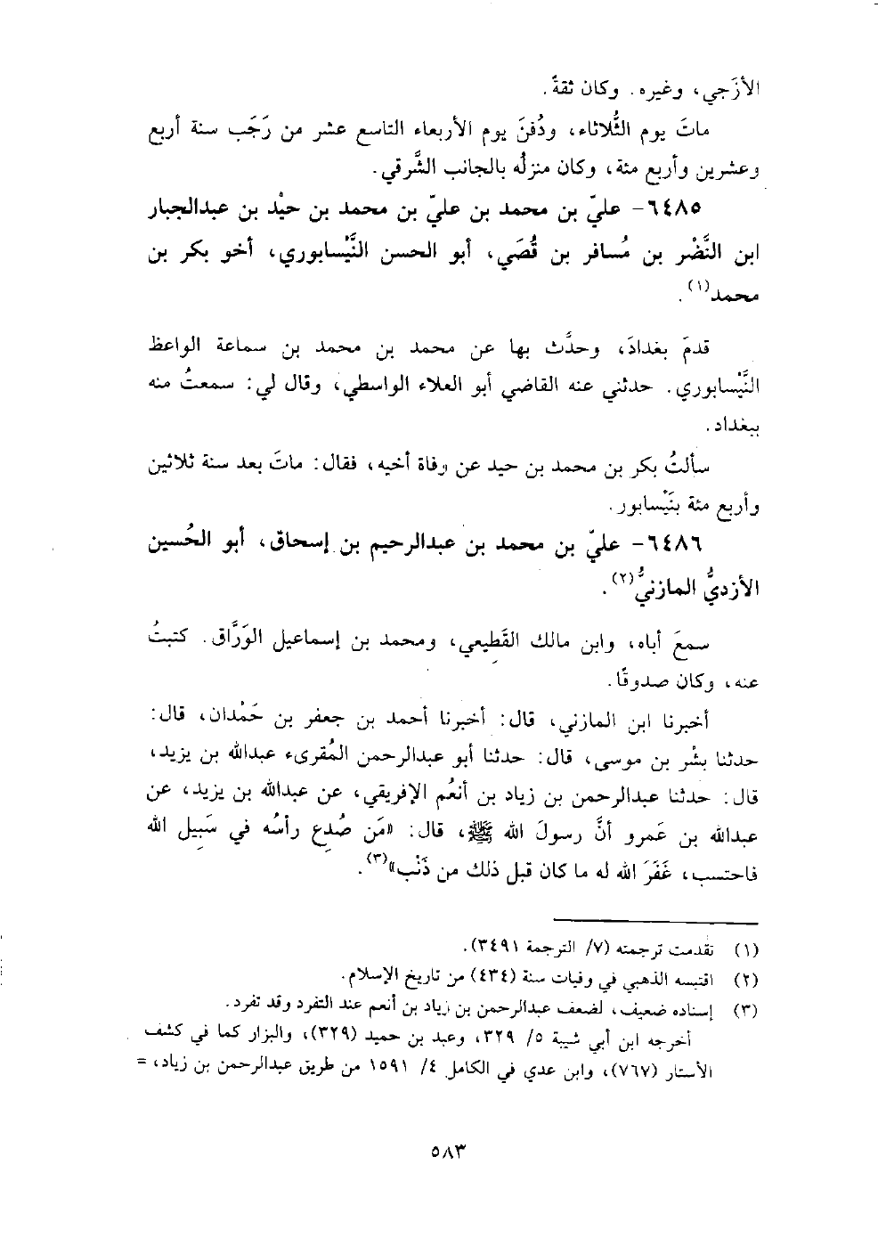 6486 - علي بْن مُحَمَّد بْن عَبْد الرحيم بْن إِسْحَاق أَبُو الحسين الأزدي المازني سمع أباه، وابن مالك القطيعي، ومحمد بن إسماعيل الوراق، كتبت عنه، وكان صدوقا.
