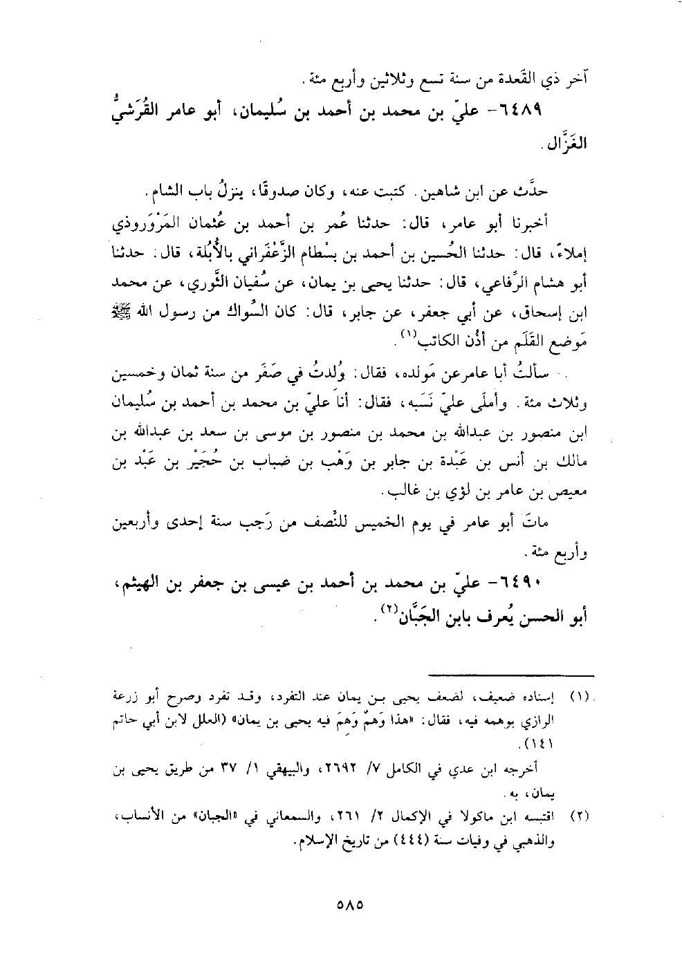 (4050) -[13: 585] أَخْبَرَنَا أَبُو عَامِرٍ، قَالَ: حَدَّثَنَا عُمَرُ بْنُ أَحْمَدَ بْنِ عُثْمَانَ الْمَرْوَرُّوذِيُّ إِمْلاءً، قَالَ: حَدَّثَنَا الْحُسَيْنُ بْنُ أَحْمَدَ بْنِ بِسْطَامٍ الزَّعْفَرَانِيُّ بِالأُبُلَّةِ، قَالَ: حَدَّثَنَا أَبُو هِشَامٍ الرِّفَاعِيُّ، قَالَ: حَدَّثَنَا يَحْيَى بْنُ يَمَانٍ، عَنْ سُفْيَانَ الثَّوْرِيِّ، عَنْ مُحَمَّدِ بْنِ إِسْحَاقَ، عَنْ أَبِي جَعْفَرٍ، عَنْ جَابِرٍ، قَالَ: " كَانَ السِّوَاكُ مِنْ رَسُولِ اللَّهِ صَلَّى اللَّهُ عَلَيْهِ وَسَلَّمَ مَوْضِعَ الْقَلَمِ مِنْ أُذُنِ الْكَاتِبِ " سألت أبا عامر عَن مولده، فقال: ولدت فِي صفر من سنة ثمان وخمسين وثلاث مائة، وأملى عليَّ نسبه، فقال: أنا علي بن محمد بْن أَحْمَد بْن سُلَيْمَان بْن منصور بْن عَبْد اللَّه بْن مُحَمَّد بْن منصور بْن مُوسَى بْن سعد بْن عَبْد اللَّه بْن مالك بْن أنس بْن عبدة بْن جابر بْن وهب بْن ضباب بْن حجير بْن عَبْد بْن معيص بْن عامر بْن لؤي بْن غالب.