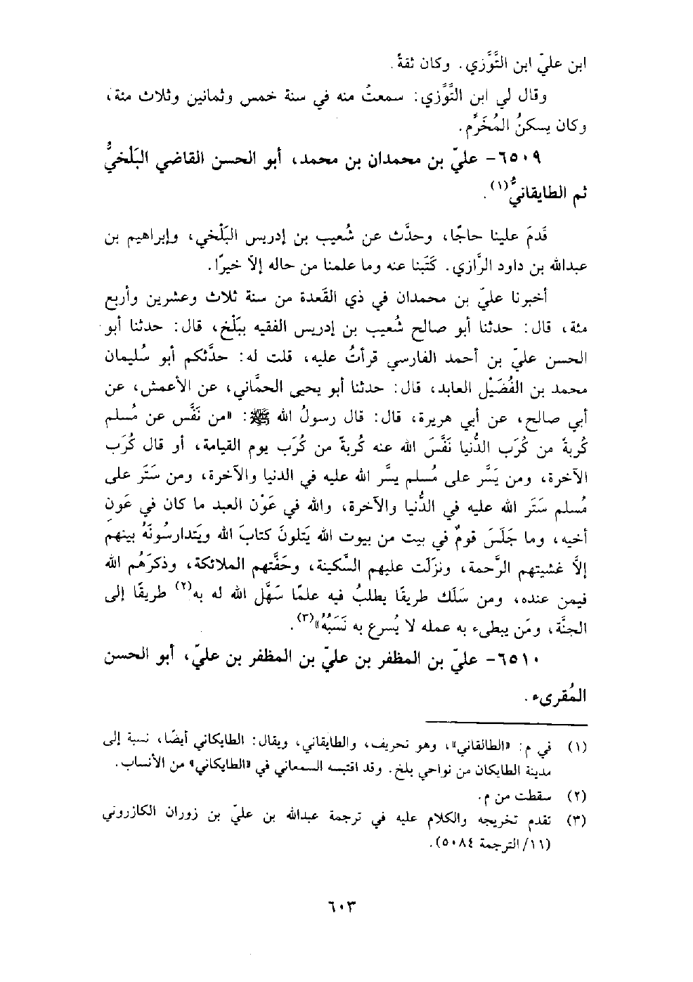 (4060) -[13: 603] أَخْبَرَنَا عَلِيُّ بْنُ مُحَمَّدَان فِي ذِي الْقَعْدَةِ مِنْ سَنَةِ ثَلاثٍ وَعِشْرِينَ وَأَرْبَعِ مِائَةٍ، قَالَ: حَدَّثَنَا أَبُو صَالِحٍ شُعَيْبُ بْنُ إِدْرِيسَ الْفَقِيهُ بِبَلْخَ، قَالَ: حَدَّثَنَا أَبُو الْحَسَنِ عَلِيُّ بْنُ أَحْمَدَ الْفَارِسِيُّ، قَرَأْتُ عَلَيْهِ، قُلْتُ لَهُ: حَدَّثَكُمْ أَبُو سُلَيْمَانَ مُحَمَّدُ بْنُ الْفُضَيْلِ الْعَابِدُ، قَالَ: حَدَّثَنَا أَبُو يَحْيَى الْحِمَّانِيُّ، عَنِ الأَعْمَشِ، عَنْ أَبِي صَالِحٍ، عَنْ أَبِي هُرَيْرَةَ، قَالَ: قَالَ رَسُولُ اللَّهِ صَلَّى اللَّهُ عَلَيْهِ وَسَلَّمَ: " مَنْ نَفَّسَ عَنْ مُسْلِمٍ كُرْبَةً مِنْ كُرَبِ الدُّنْيَا، نَفَّسَ اللَّهُ عَنْهُ كُرْبَةً مِنْ كُرَبِ يَوْمِ الْقِيَامَةِ، أَوْ قَالَ: كُرَبِ الآخِرَةِ، وَمَنْ يَسَّرَ عَلَى مُسْلِمٍ يَسَّرَ اللَّهُ عَلَيْهِ فِي الدُّنْيَا وَالآخِرَةِ، وَمَنْ سَتَرَ عَلَى مُسْلِمٍ سَتَرَ اللَّهُ عَلَيْهِ فِي الدُّنْيَا وَالآخِرَةِ، وَاللَّهُ فِي عَوْنِ الْعَبْدِ مَا كَانَ فِي عَوْنِ أَخِيهِ، وَمَا جَلَسَ قَوْمٌ فِي بَيْتٍ مِنْ بُيُوتِ اللَّهِ، يَتْلُونَ كِتَابَ اللَّهِ، وَيَتَدَارَسُونَهُ بَيْنَهُمْ، إِلا غَشِيَتْهُمُ الرَّحْمَةُ، وَنَزَلَتْ عَلَيْهِمُ السَّكِينَةُ، وَحَفَّتْهُمُ الْمَلائِكَةُ، وَذَكَرَهُمُ اللَّهُ فِيمَنْ عِنْدَهُ، وَمَنْ سَلَكَ طَرِيقًا يَطْلُبُ فِيهِ عِلْمًا سَهَّلَ اللَّهُ لَهُ بِهِ طَرِيقًا إِلَى الْجَنَّةِ، وَمَنْ يُبْطِئُ بِهِ عَمَلُهُ، لا يُسْرِعُ بِهِ نَسَبُهُ "