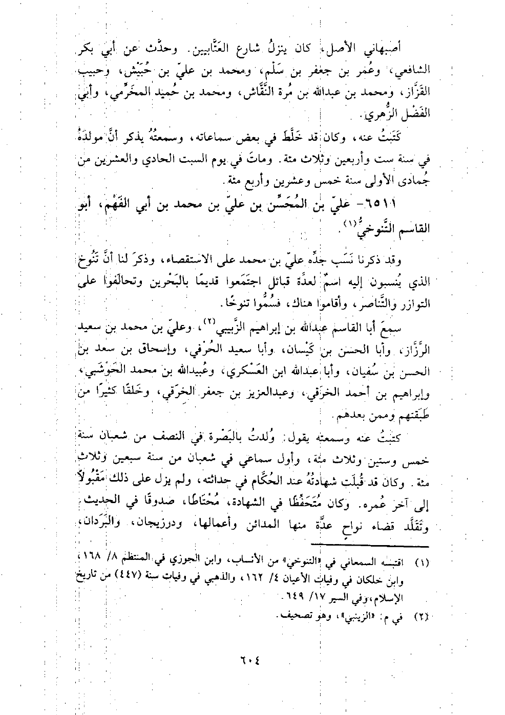 6511 - علي بْن المحسن بْن علي بْن مُحَمَّد بْن أَبِي الفهم أَبُو القاسم التنوخي وقد ذكرنا نسب جده علي بْن مُحَمَّد على الاستقصاء، وذكر لنا أن تنوخ الذين ينتسبون إليه اسم لعدة قبائل اجتمعوا قديما بالبحرين، وتحالفوا على التوازر والتناصر، وأقاموا هناك، فسموا تنوخا.