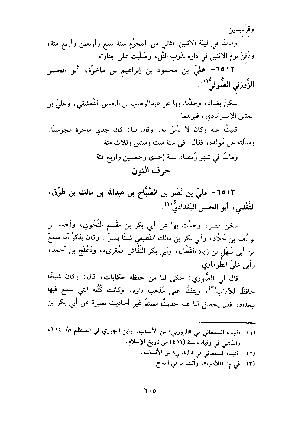 6512 - علي بْن محمود بْن إِبْرَاهِيم بْن ماخرة أَبُو الحسن الزوزني الصوفي سكن بَغْدَاد، وحدث بها عَن عَبْد الوهاب بْن الحسن الدمشقي، وعلي بْن المثنى الإستراباذي، وغيرهما.
