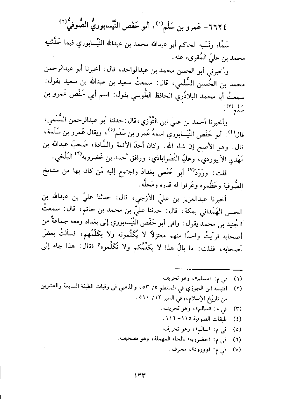 6624 - عمرو بْن سلم، أَبُو حفص النيسابوري الصوفي سماه ونسبه الحاكم أَبُو عبد اللَّه مُحَمَّد بْن عبد اللَّه النيسابوري، فيما حَدَّثَنِيه مُحَمَّد بْن علي المقرئ عنه.