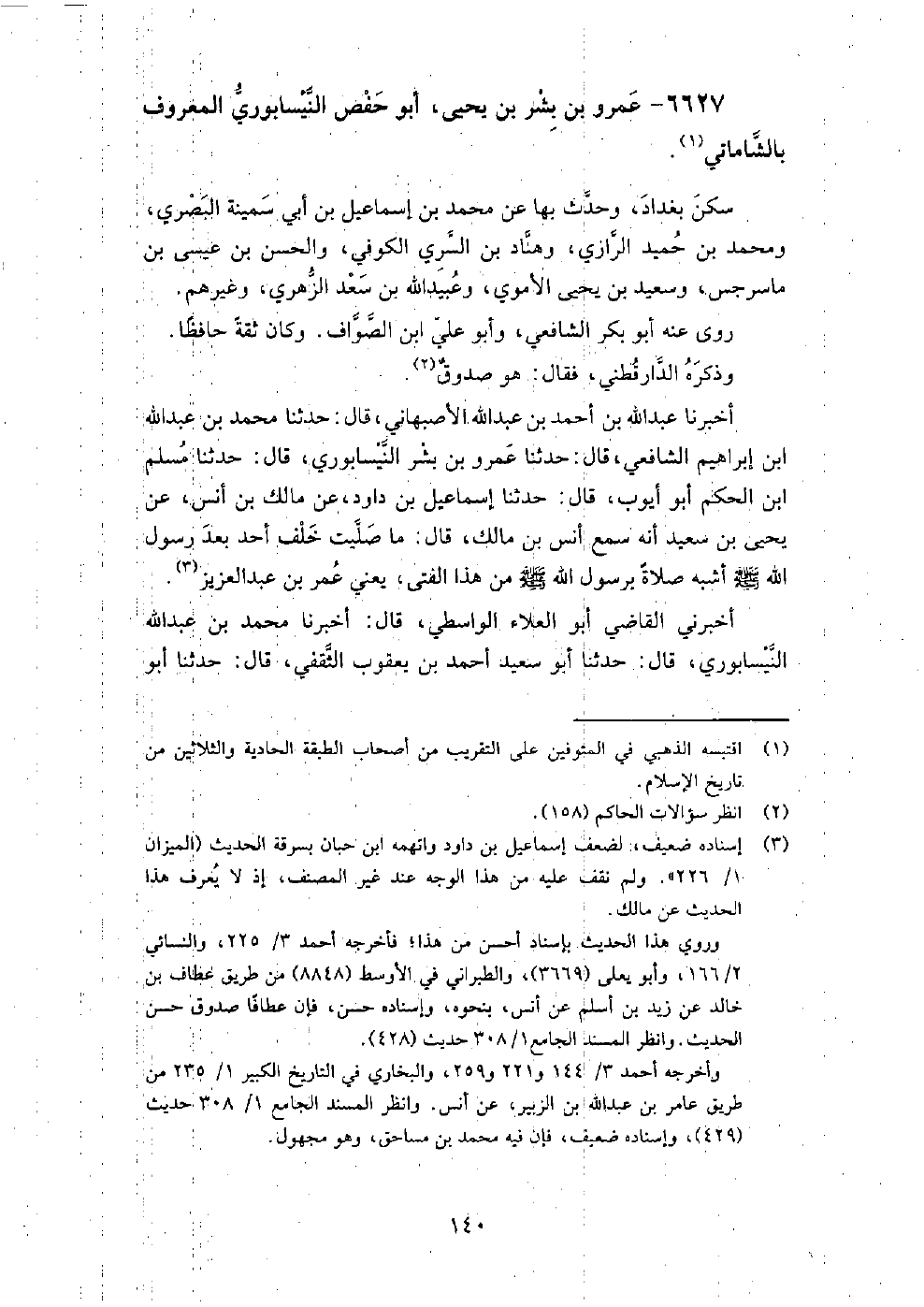 6627 - عمرو بْن بشر بْن يحيى أَبُو حفص النيسابوري المعروف بالشاماتي سكن بغداد، وحدث بها عَنْ مُحَمَّد بْن إسماعيل بْن أبي سمينة البصري، ومحمد بْن حميد الرازي، وهناد بْن السري الكوفي، والحسن بْن عيسى بْن ماسرجس، وسعيد بْن يحيى الأموي، وعبيد اللَّه بْن سعد الزهري، وغيرهم.