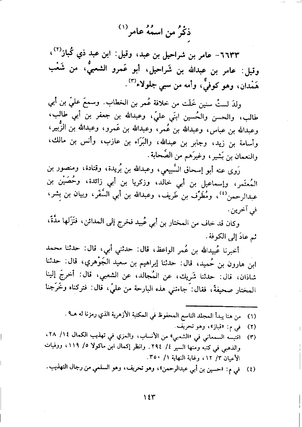 6633 - عامر بْن شراحيل بْن عبد، وقيل: ابْن عبد ذي كباز، وقيل: عامر بْن عبد اللَّه بْن شراحيل، أَبُو عمرو الشعبي من شعب همدان، وهو كوفي، وأمه من سبي جلولاء،