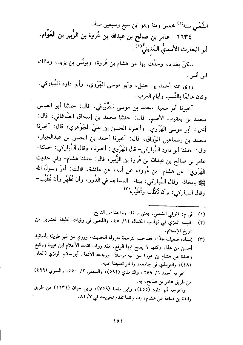 6634 - عامر بْن صالح بْن عبد اللَّه بْن عروة بْن الزبير بْن العوام، أَبُو الحارث الأسدي المديني سكن بغداد، وحدث بها عَنْ هشام بْن عروة، ويونس بْن يزيد، ومالك بْن أنس.
