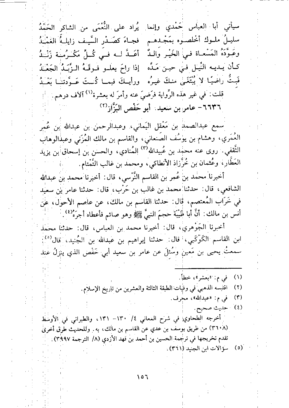 (4133) -[14: 156] أَخْبَرَنَا مُحَمَّدُ بْنُ عُمَرَ بْنِ الْقَاسِمِ النَّرْسِيُّ، قَالَ: أَخْبَرَنَا مُحَمَّدُ بْنُ عَبْدِ اللَّهِ الشَّافِعِيُّ، قَالَ: حَدَّثَنَا مُحَمَّدُ بْنُ غَالِبِ بْنِ حَرْبٍ، قَالَ: حَدَّثَنَا عَامِرُ بْنُ سَعِيدٍ فِي خَرَابِ الْمُعْتَصِمِ، قَالَ: حَدَّثَنَا الْقَاسِمُ بْنُ مَالِكٍ، عَنْ عَاصِمٍ الأَحْوَلِ، عَنْ أَنَسِ بْنِ مَالِكٍ " أَنَّ أَبَا طَيْبَةَ حَجَمَ النَّبِيَّ صَلَّى اللَّهُ عَلَيْهِ وَسَلَّمَ وَهُوَ صَائِمٌ " فَأَعْطَاهُ أَجْرَهُ أَخْبَرَنَا الجوهري، قَالَ: أَخْبَرَنَا مُحَمَّد بْن العباس، قَالَ: حَدَّثَنَا مُحَمَّد بْن القاسم الكوكبي، قَالَ: حَدَّثَنَا إبراهيم بْن عبد اللَّه بْن الجنيد، قَالَ: سمعت يحيى بْن معين وسئل عَنْ عامر بْن سعيد أبي حفص الذي ينزل عند درب على الطويل، فقال: أَبُو حفص البزاز ثقة، وأحسن القول فيه، هو الذي دخل على رياح بْن زيد، وروى عَنْ عبد الصمد بْن معقل.
